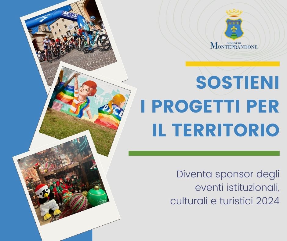 MONTEPRANDONE – Il Comune di Monteprandone intende individuare soggetti disponibili a sponsorizzare la realizzazione dei eventi e opere istituzionali, culturali e turistiche che saranno realizzate nel corso del 2024. E’ stato pertanto pubblicato un avviso finalizzato a promuovere il territorio e le sue peculiarità nonché creare occasioni di socializzazione.