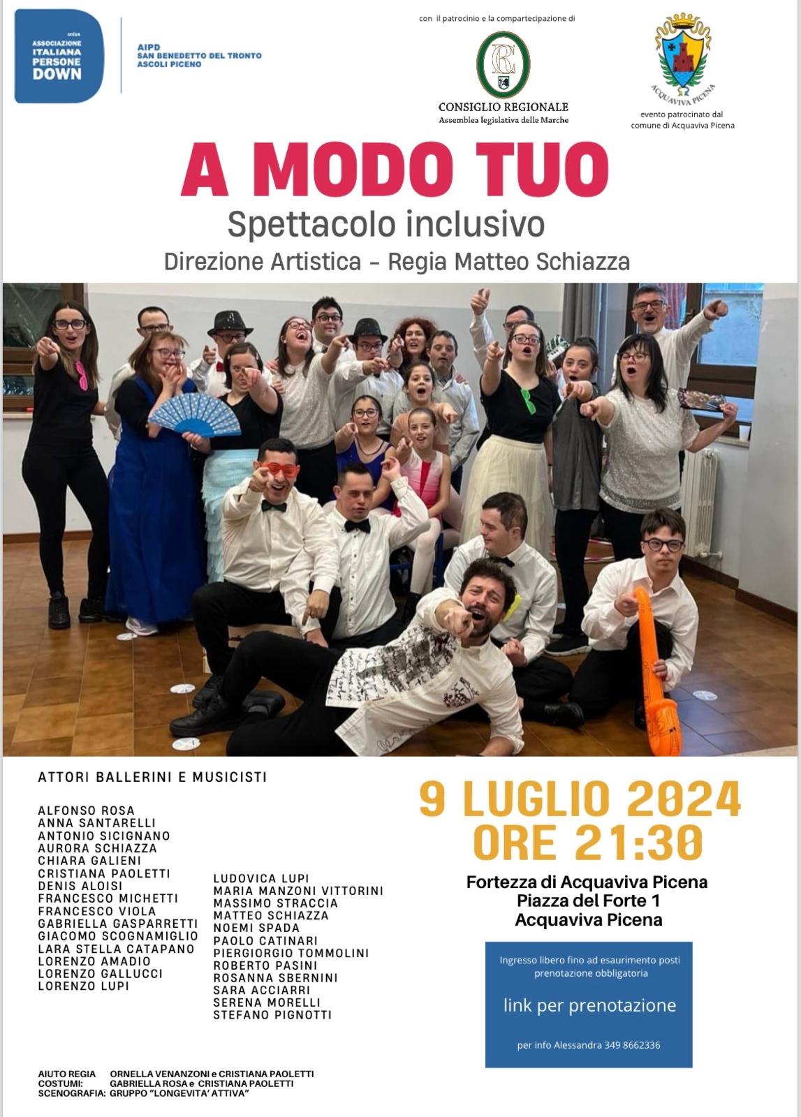 ACQUAVIVA PICENA – L’Amministrazione Comunale di Acquaviva Picena e l’Associazione Italiana Persone Down di San Benedetto del Tronto sono liete è di annunciare la terza replica dello spettacolo di inclusione, che si terrà martedì 9 luglio 2024 presso la suggestiva Fortezza di Acquaviva Picena alle ore 21:30.