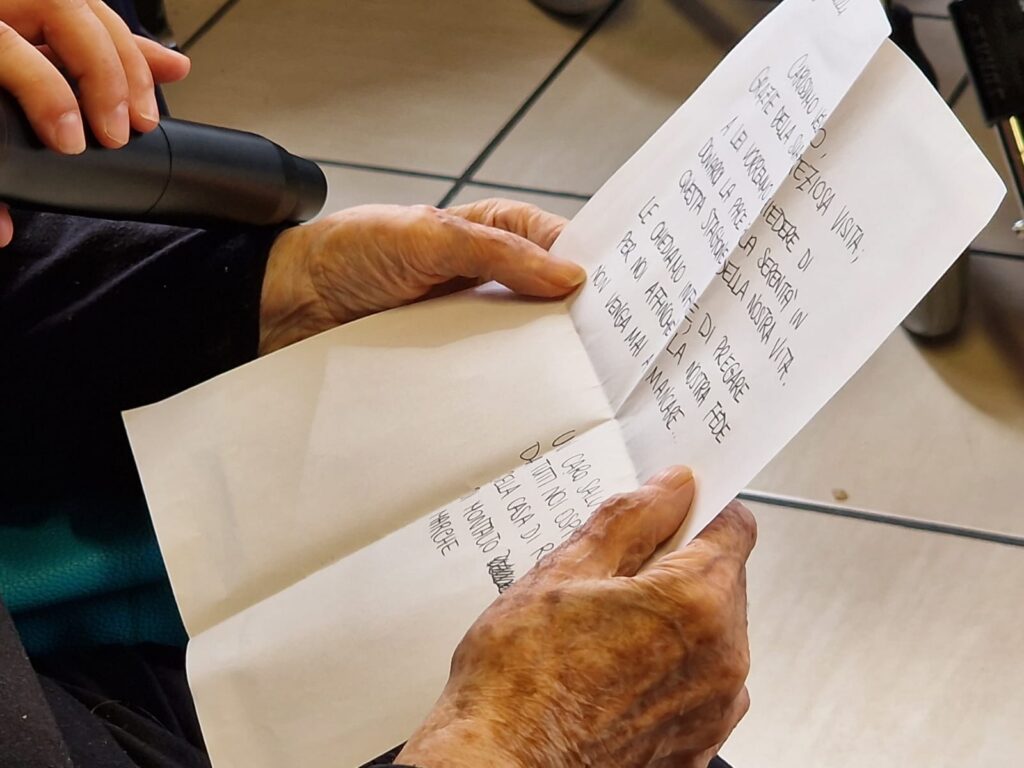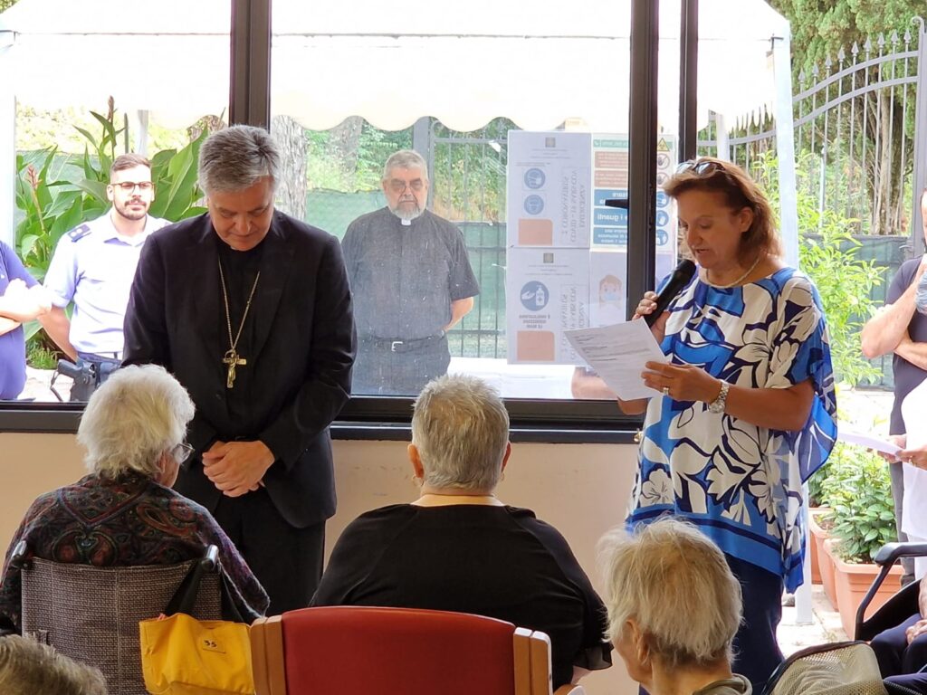 Poi la preghiera di un’altra signora ospite della struttura. Queste le sue parole: “Carissimo vescovo, grazie della sua preziosa visita. A lei vorremmo chiedere di donarci la pace e la serenità in questa stagione della nostra vita. Le chiediamo infine di pregare per noi, affinché la nostra fede non venga mai a mancare”.