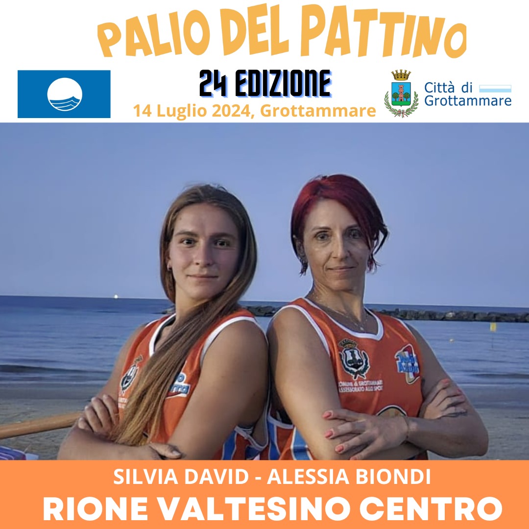 Tra i 7 equipaggi composti da due vogatori non professionisti portacolori dei rioni partecipanti, per la prima volta il Palio di Grottammare registra il debutto di una coppia completamente al femminile: la veterana Alessia Biondi e l’esordiente Silvia David sono pronte a scrivere la storia per il rione Valtesino Centro.
