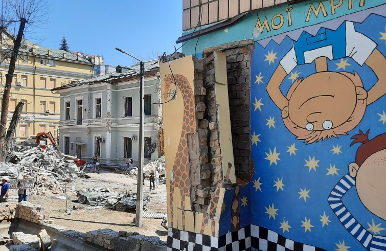 (da Kyiv) Peluche buttati per terra. Bambole, giocattoli e macchinine messi dentro sacchi bianchi, lasciati sui marciapiedi, tra calcinacci, polvere e pezzi di ferro. Le macerie sono dappertutto. Anche i coloratissimi murales che erano stati dipinti per accogliere i piccoli pazienti, sono stati sfregiati dalle schegge. C’è odore di bruciato all’ospedale. Il fumo ancora esce dai pini anneriti dal fuoco che si trovano all’ingresso. Addetti del comune stanno lavorando a liberare le struttura. Si scava. Si pulisce. I caterpillar portano via i pezzi più pesanti. Ma i danni sono ingenti. Un intero padiglione dovrà essere buttato giù e interamente ricostruito.