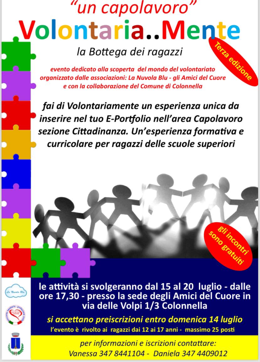 COLONNELLA – Riprende a Colonnella, per il terzo anno consecutivo, il progetto estivo “Volontaria … Mente“, una iniziativa dedicata alla scoperta del mondo del volontariato ed organizzata dalla Cooperativa Sociale “La Nuvola Blu” e dall’ Associazione “Amici del Cuore, in collaborazione con il Comune di Colonnella.
