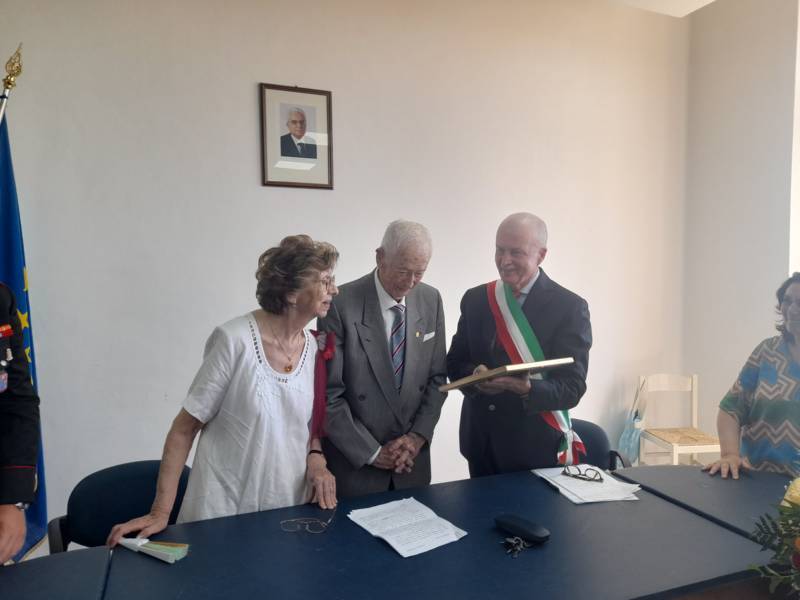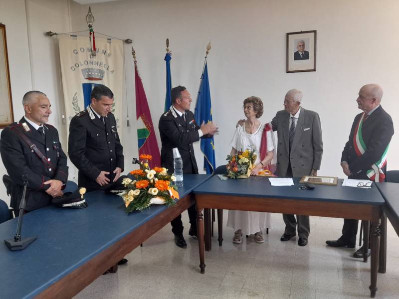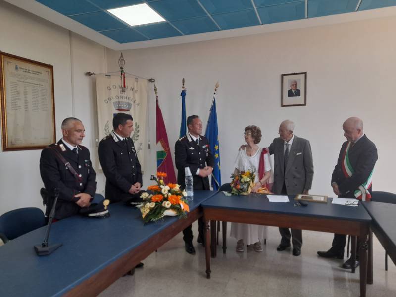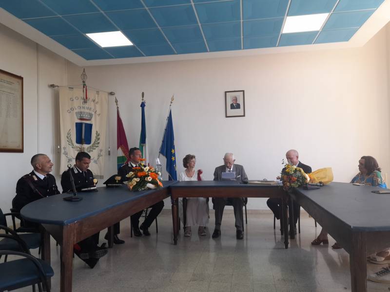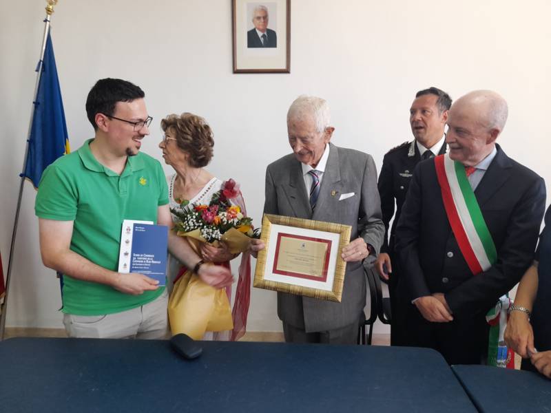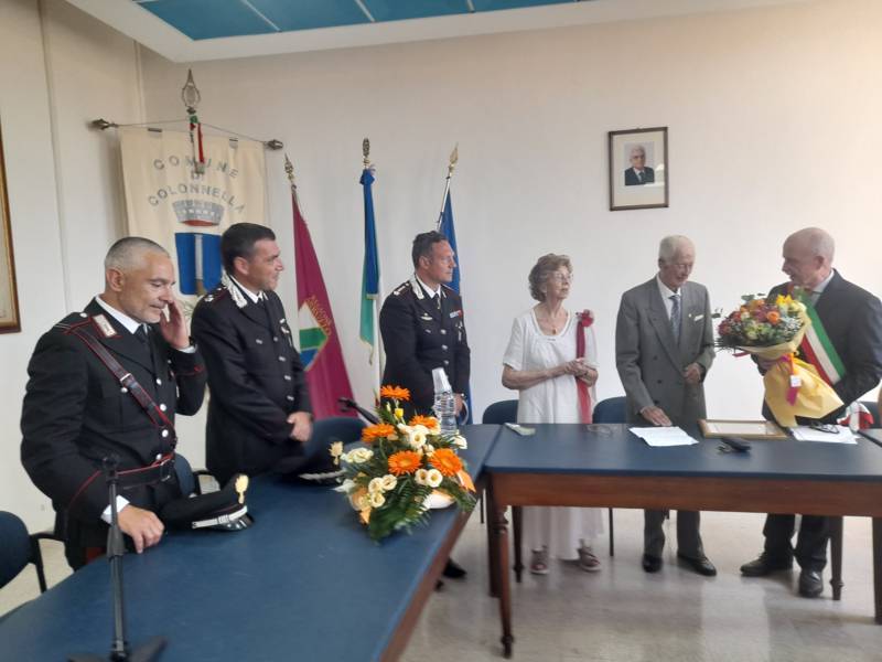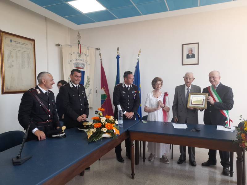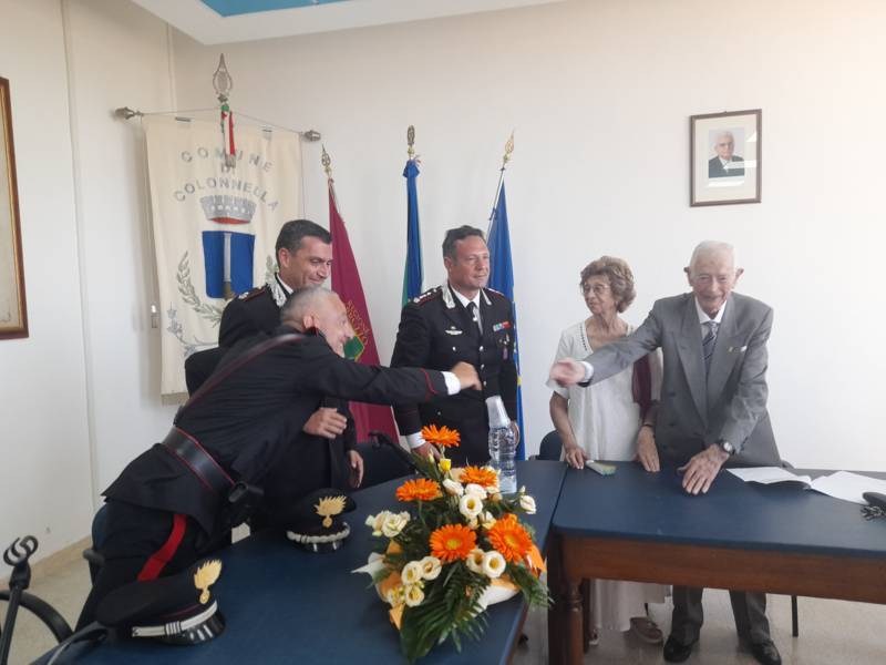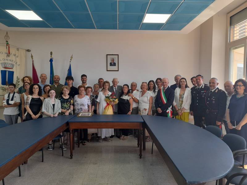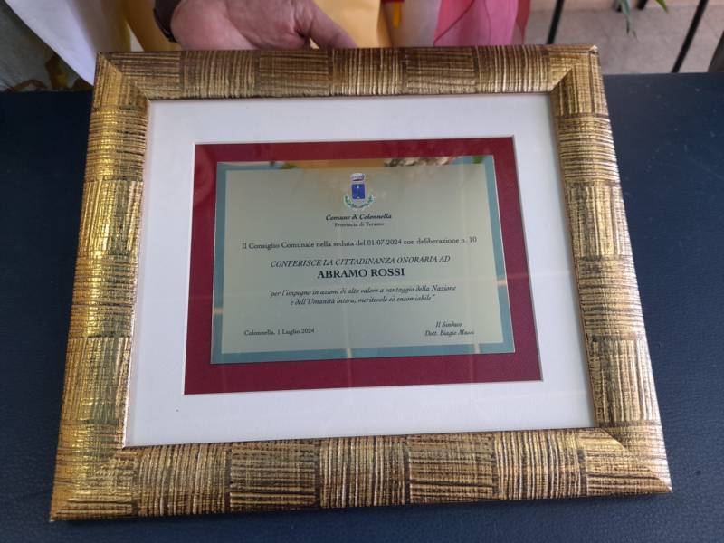 COLONNELLA – Il centenario Abramo Rossi, sottotenente a titolo onorifico dell’Arma dei Carabinieri, colonnellese di origine, eroe della Seconda Guerra Mondiale, Medaglia d’Onore come Volontario della Libertà e grande divulgatore – nelle Scuole di ogni ordine e grado – dei valori di pace, uguaglianza e libertà, ha ricevuto la cittadinanza onoraria di Colonnella. La cerimonia in cui gli è stata conferita è avvenuta Sabato 13 Luglio, alle ore 11:00, presso la Sala Consiliare del Comune di Colonnella, alla presenza del sindaco Biagio Massi, della vicesindaca Mirella Pontuti, degli assessori Stefano Bastianelli, Elia Grasso e Giorgia Piccioni e della consigliera Eleanna Pandolfelli. Presenti anche i vertici locali dell’Arma: il Colonnello Pasquale Saccone, Comandante del Comando Provinciale di Teramo; il Maggiore Gianluca Ceccagnoli, comandante della Compagnia di Alba Adriatica; il Maresciallo Ordinario Gianni Mattioli, Comandante in Sede Vacante della Stazione dei Carabinieri di Colonnella. Presenti, in rappresentanza della comunità cristiana colonnellese, anche il parroco don Dino Straccia e il priore della Confraternita Madonna del Suffragio, Guerino Reganatini. Tra il pubblico anche il dott. Matteo Di Natale, autore del libro “Storia dei Carabinieri sul territorio della Compagnia di Alba Adriatica (già Compagnia di Nereto)”, scritto insieme all’avv. Bruno Massucci e contenente anche la storia di Abramo Rossi.