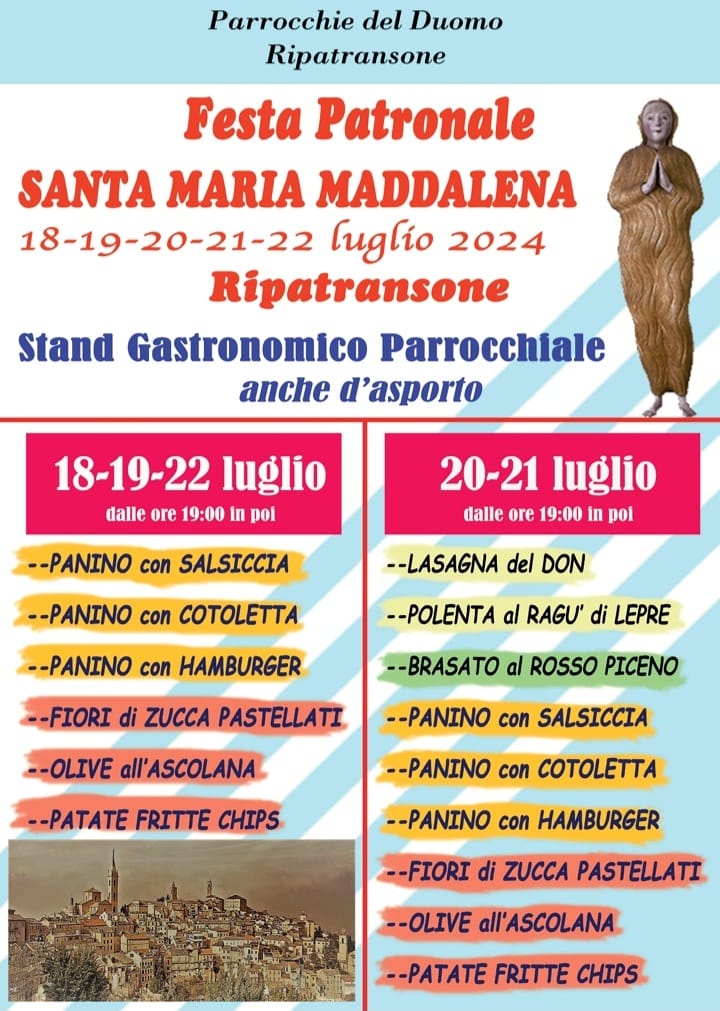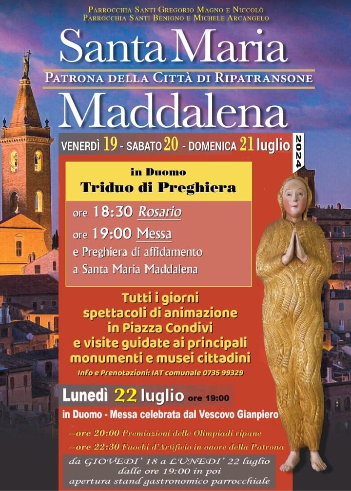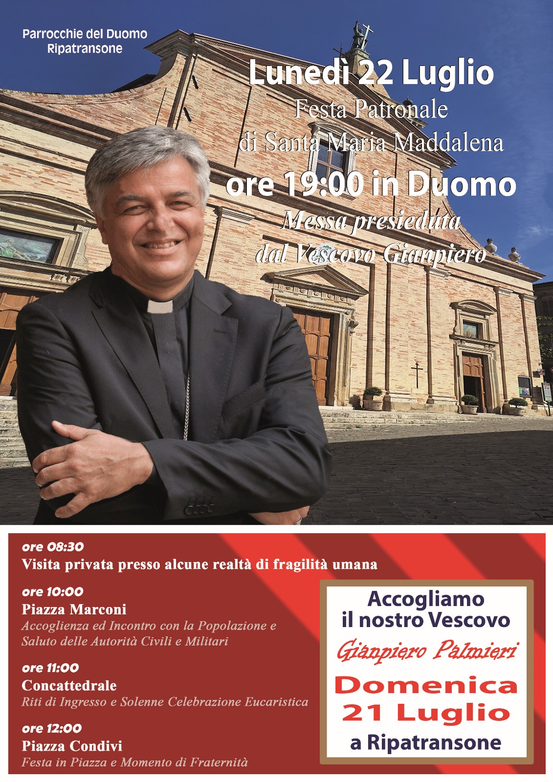 Queste le parole di don Nicola Spinozzi, parroco del Duomo di Ripatransone: “La nostra Comunità cristiana è in trepida attesa di ricevere la visita del vescovo Palmieri, nuovo Pastore della nostra Diocesi. Vivremo diversi momenti di condivisione, gioia e fraternità: dalla visita privata che verrà effettuata alle realtà più fragili all’accoglienza pubblica in piazza, dall’incontro con le autorità civili e militari alla celebrazione eucaristica in Duomo. I fedeli sono inoltre molto felici di poter condividere con il nuovo vescovo anche la festa patronale di Santa Maria Maddalena che verrà celebrata il giorno successivo, Lunedì 22 Luglio, alle ore 19:00, con una Santa Messa presieduta dal vescovo. Per prepararci al meglio sia ad onorare la nostra Santa Patrona sia ad accogliere il nostro nuovo vescovo Gianpiero, da Giovedì 18 Luglio in poi, ogni giorno, vivremo momenti di preghiera in Duomo alle ore 18:30 e, a seguire, spettacoli e festa in piazza, dove la parrocchia sarà presente anche con uno stand gastronomico”.