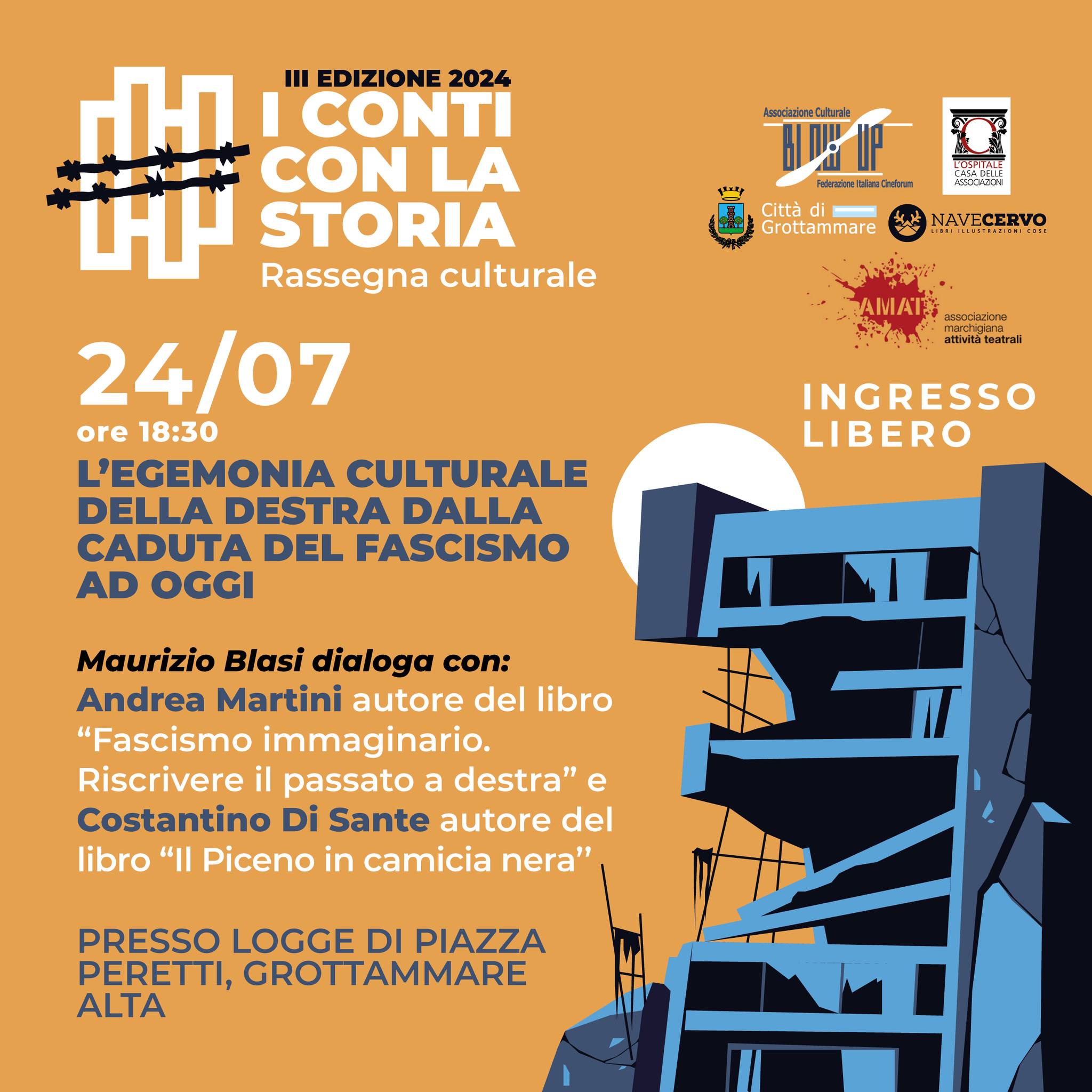 GROTTAMMARE – Per la rassegna di approfondimenti storici e culturali “I conti con la Storia” un fuori programma estivo quello di mercoledì prossimo 24 luglio: a 81 anni dalla caduta del regime fascista, Grottammare ospiterà un dibattito sull’egemonia culturale della destra dalla caduta del fascismo ad oggi.