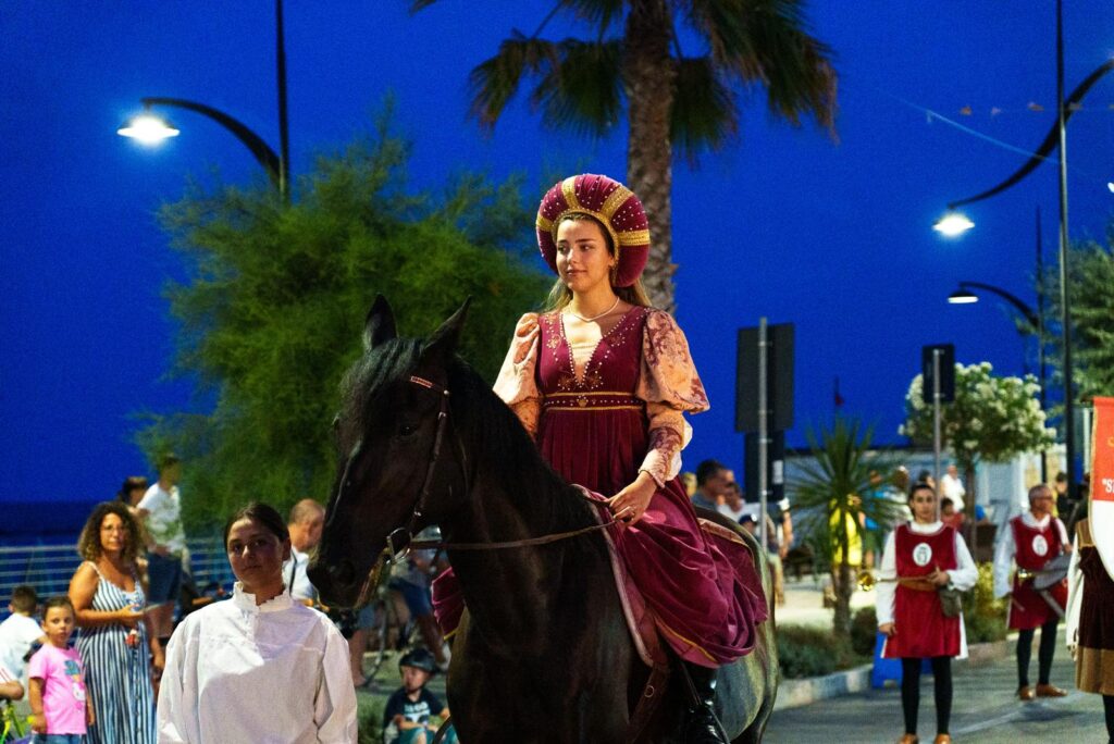 Una due giorni, dicevamo, ricca di storia, cultura e spettacolo, che ha visto una grande partecipazione di cittadini e turisti sia al sabato con lo spettacolo di falconeria di Alessandra Giampaoli e il banchetto storico, che per il gran finale di domenica con il corteo che ha animato il lungomare fino a piazza Cavour dove è andato in scena lo spettacolo “Luce” a cura della Compagnia dei folli, aperto dalla suggestiva esibizione di sbandieratori e tamburini.