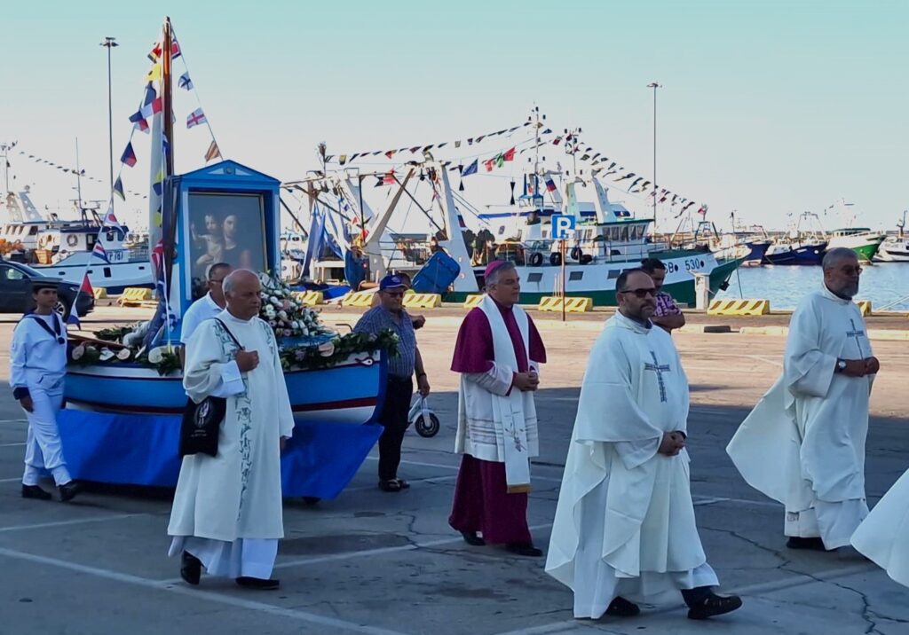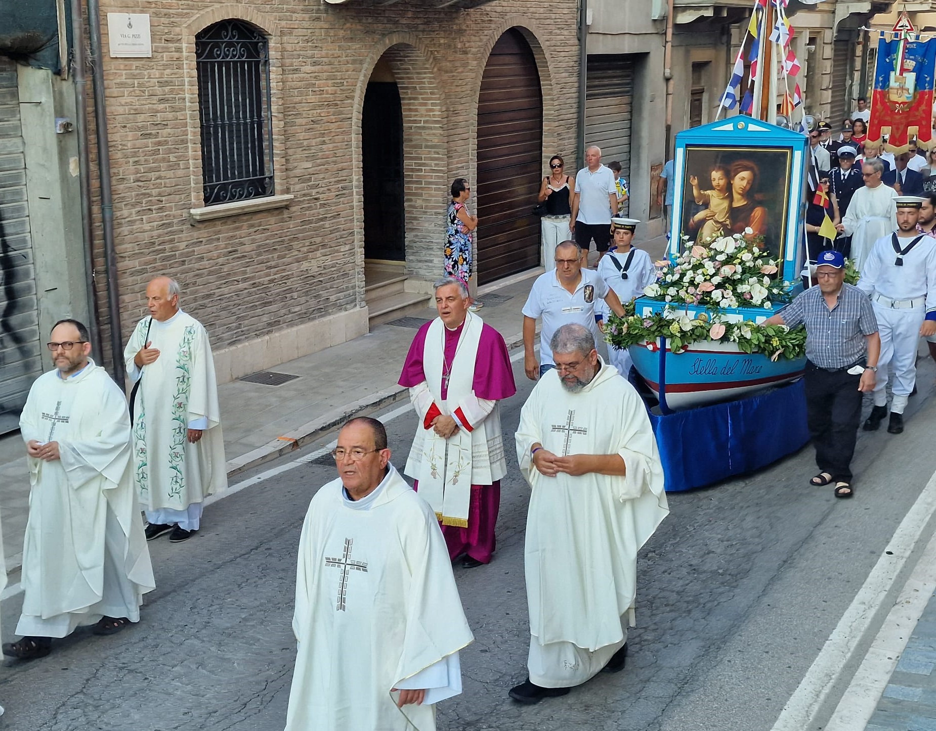 DIOCESI – Si sono conclusi ieri, Domenica 28 Luglio, i festeggiamenti dei fedeli della Parrocchia di Santa Maria della Marina in onore della loro Patrona, la Regina del Mare. Le manifestazioni religiose sono infatti terminate con la Processione alle ore 18:30 dal porto fino alla Cattedrale e la celebrazione della Santa Messa alle ore 19:30 all’aperto in piazza Nardone, presieduta dal nuovo vescovo diocesano, mons. Gianpiero Palmieri, e concelebrata dai sacerdoti e dai diaconi della città rivierasca: don Patrizio Spina, parroco della comunità, nonché vicario generale; don Luciano Paci e mons. Romualdo Scarponi, entrambi parroci emeriti della Marina; padre Mario Amadeo, parroco della comunità di San Giuseppe; don Ulderico Ceroni, parroco della comunità di San Pio X; don Guido Coccia, parroco della comunità di San Benedetto Martire; don Gianni Croci, parroco della comunità di San Filippo Neri; don Emmanuele Iotti, appartenente al Cammino Neocatecumenale, originario di San Benedetto del Tronto ed attualmente incardinato nella Diocesi di Cartagena, in Spagna, come vicario parrocchiale in una parrocchia della città di Murcia; i diaconi Walter Gandolfi, Emanuele Imbrescia e Pietro Mazzocchi.
