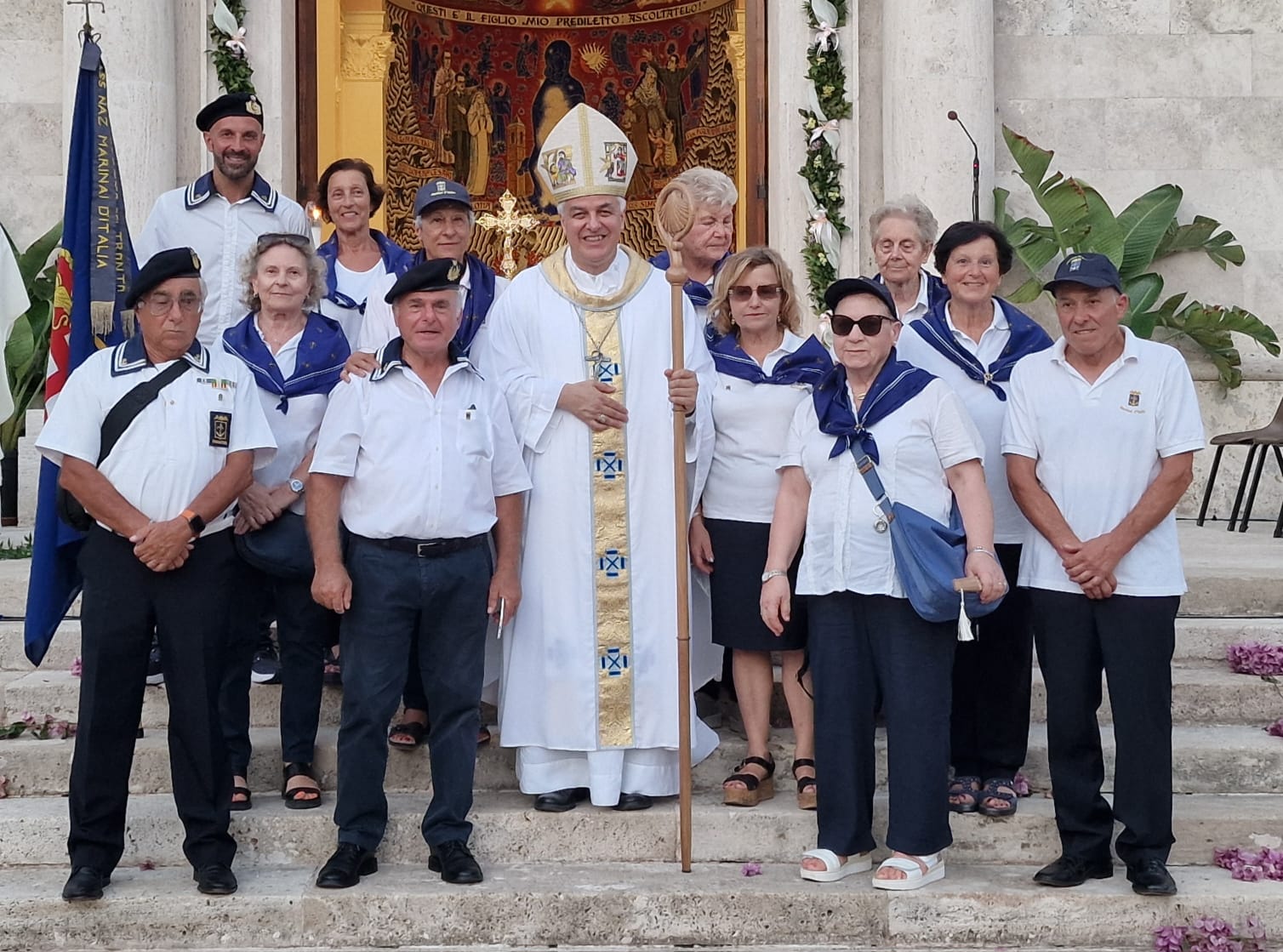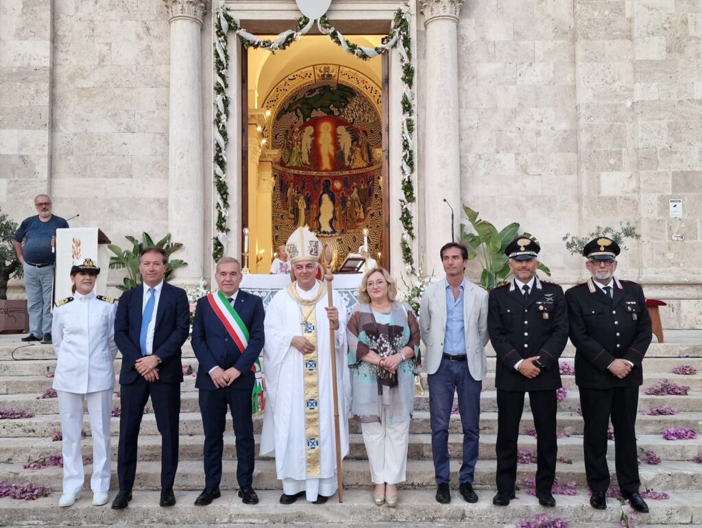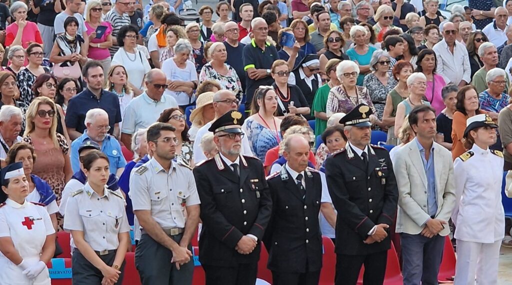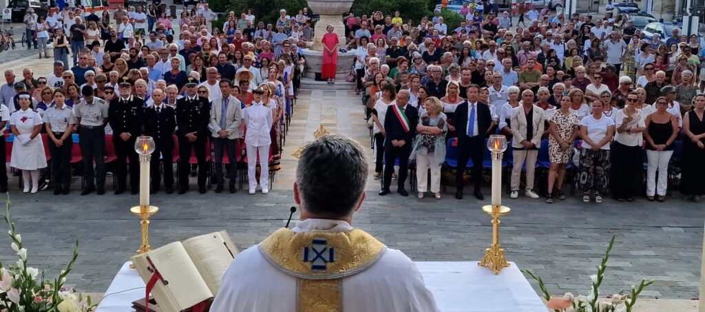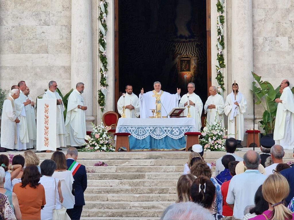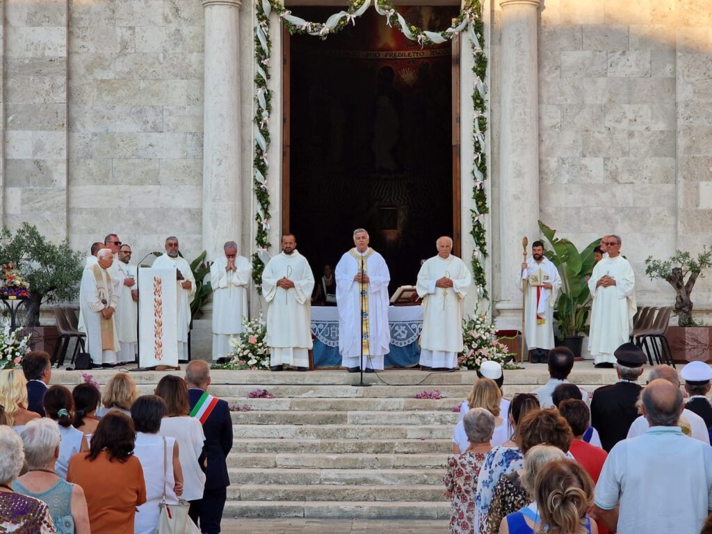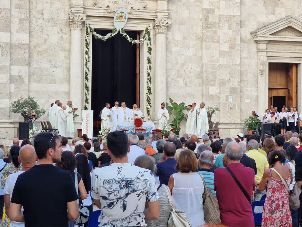 Queste le parole del vescovo Gianpiero Palmieri durante l’omelia: “È molto bello celebrare qui, nella piazza davanti alla Cattedrale, dopo aver vissuto una processione insieme all’immagine della Stella del Mare. Come ci siamo detti anche ieri, celebrando l’Eucaristia al porto, Maria ci aiuta ad alzare lo sguardo. E lo fa personalmente, con ciascuno di noi, ma anche a livello comunitario, come Chiesa. Ci fa guardare le cose con un’orizzonte più ampio, ampio come quello del mare, evitando di ripiegarci nel dolore, nell’autocommiserazione, nell’essere presi da tante cose. Maria ci insegna questo perché il Signore lo ha fatto con Lei, proprio nel momento del dolore, sotto la croce, quando Gesù le ha detto di alzare lo sguardo, perché il suo dolore si sarebbe trasformato in una maternità universale, grande come il mare. Noi, come Chiesa, siamo chiamati ad imitarla: anche noi siamo chiamati ad essere madre, ad aver cura di tutti gli uomini, per mandato del Signore, continuando la Sua opera. Per questo è bellissimo girare con Maria e il Signore per le strade e sentire che niente di ciò che gli uomini e le donne vivono ci è estraneo, niente di quello che avviene nelle strade, nelle piazze, nelle case della nostra città, nel cuore di tutti gli abitanti, di chi ci vive e ci lavora, di chi ci passa per un caso o ci rimane per vacanze, ci è estraneo. E siamo chiamati ad annunciare, a testimoniare a tutti l’Amore, la tenerezza di Dio, attraverso parole di accoglienza e di speranza“.