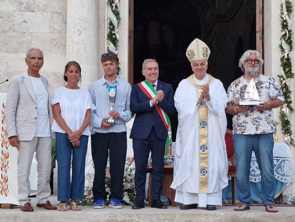 A seguire don Spina ha lasciato la parola a Manrico Urbani, ideatore del Palio Velico dei Quartieri della città di San Benedetto del Tronto e membro del Circolo Nautico, il quale ha invitato il sindaco Spazzafumo a raggiungere l’altare per premiare, insieme al vescovo Palmieri, il vincitore del Palio Velico 2024, che per questa nona edizione è stato il Quartiere Sant’Antonio. A ritirare il premio sono stati Tony Alfonsi, consigliere dell’omonimo Comitato di Quartiere, e il timoniere Matteo Terenzi, che vanta ben quattro vittorie su sei partecipazioni.