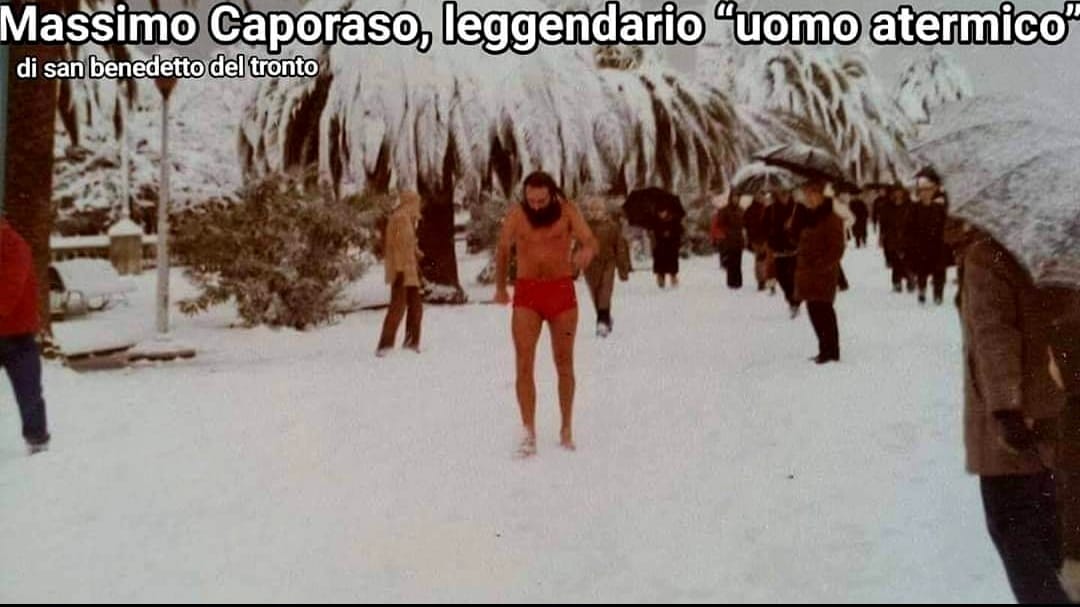 RIPATRANSONE – Sono stati celebrati ieri pomeriggio, Mercoledì 31 Luglio 2024, nella Chiesa Parrocchiale “Madonna di Fatima” in Valtesino di Ripatransone i funerali di Massimo Caporaso, da molti conosciuto a San Benedetto del Tronto, negli anni 70 / 80, come “l’Uomo Atermico”, protagonista di scene mitologiche e leggendarie che sono ancora impresse nei ricordi di coloro che lo hanno conosciuto in quegli anni. Lo si vedeva, infatti, passeggiare per San Benedetto in pieno inverno e con la neve vestito solo con deii pantaloncini corti insieme al suo inseparabile cane e poi fare il bagno in mare nell’acqua gelida. Oppure, d’estate, lo si vedeva tranquillamente andare in giro vestito con camicia, cravatta e abito elegante.