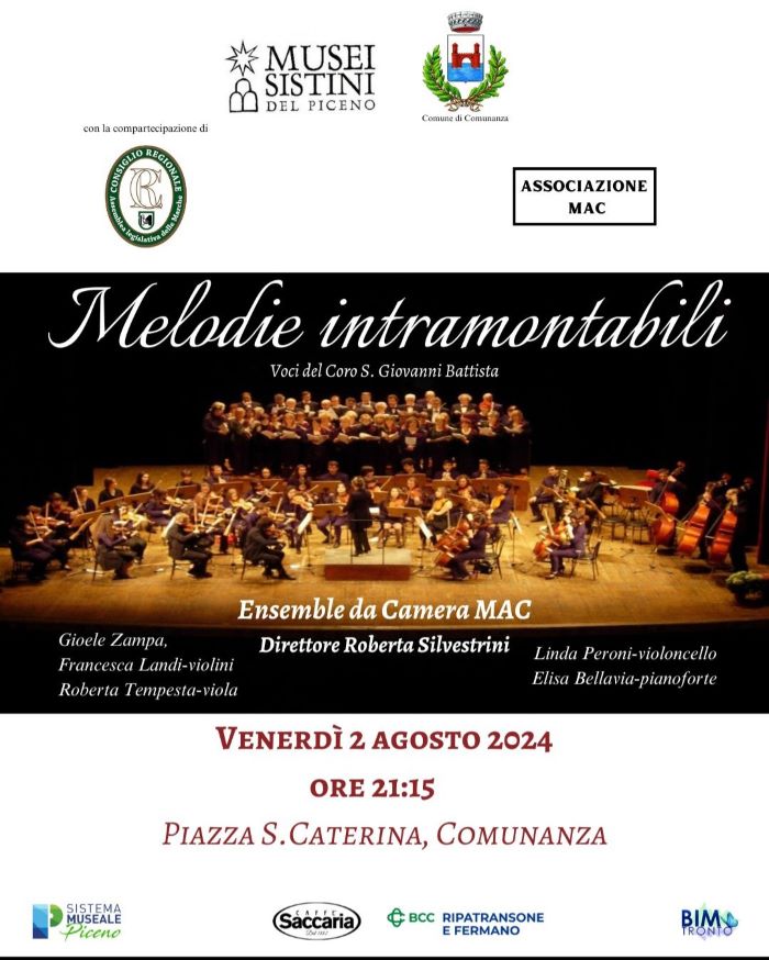 COMUNANZA – Questa sera, venerdì 2 agosto a Comunanza, in piazza Santa Caterina, alle ore 21:15, l’orchestra “Ensemble da Camera MAC” eseguirà brani musicali classici.