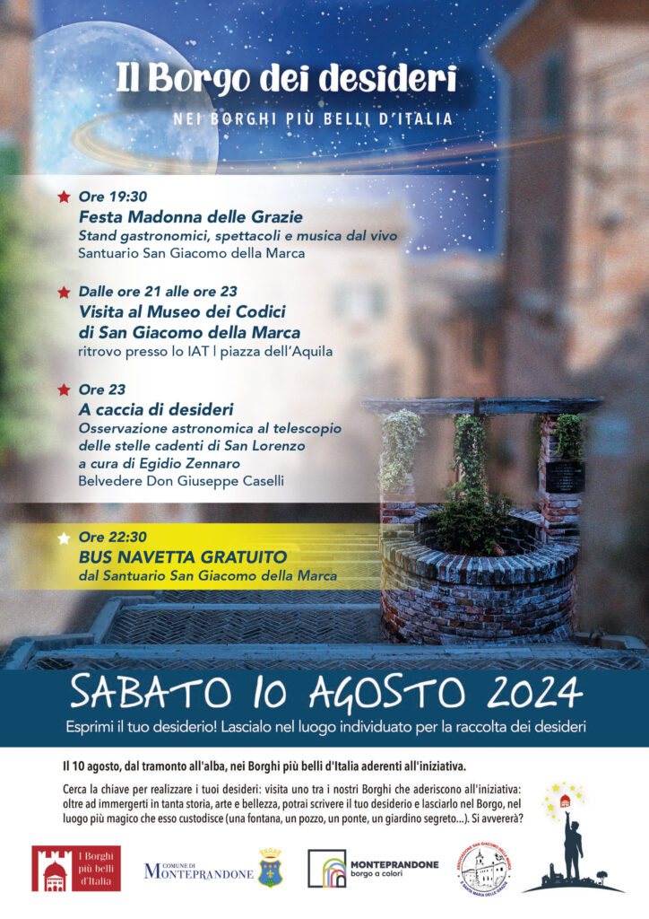 MONTEPRANDONE – Nella notte di San Lorenzo, Monteprandone diventa “Borgo dei Desideri”. Sabato 10 agosto sarà possibile immergersi nella storia, nella cultura, nell’arte e nelle bellezza di Monteprandone, uno dei borghi più belli d’Italia, esprimere i propri desideri guardando le stelle cadenti e vincere un premio messo in palio dall’associazione nazionale dei Borghi più Belli d’Italia.