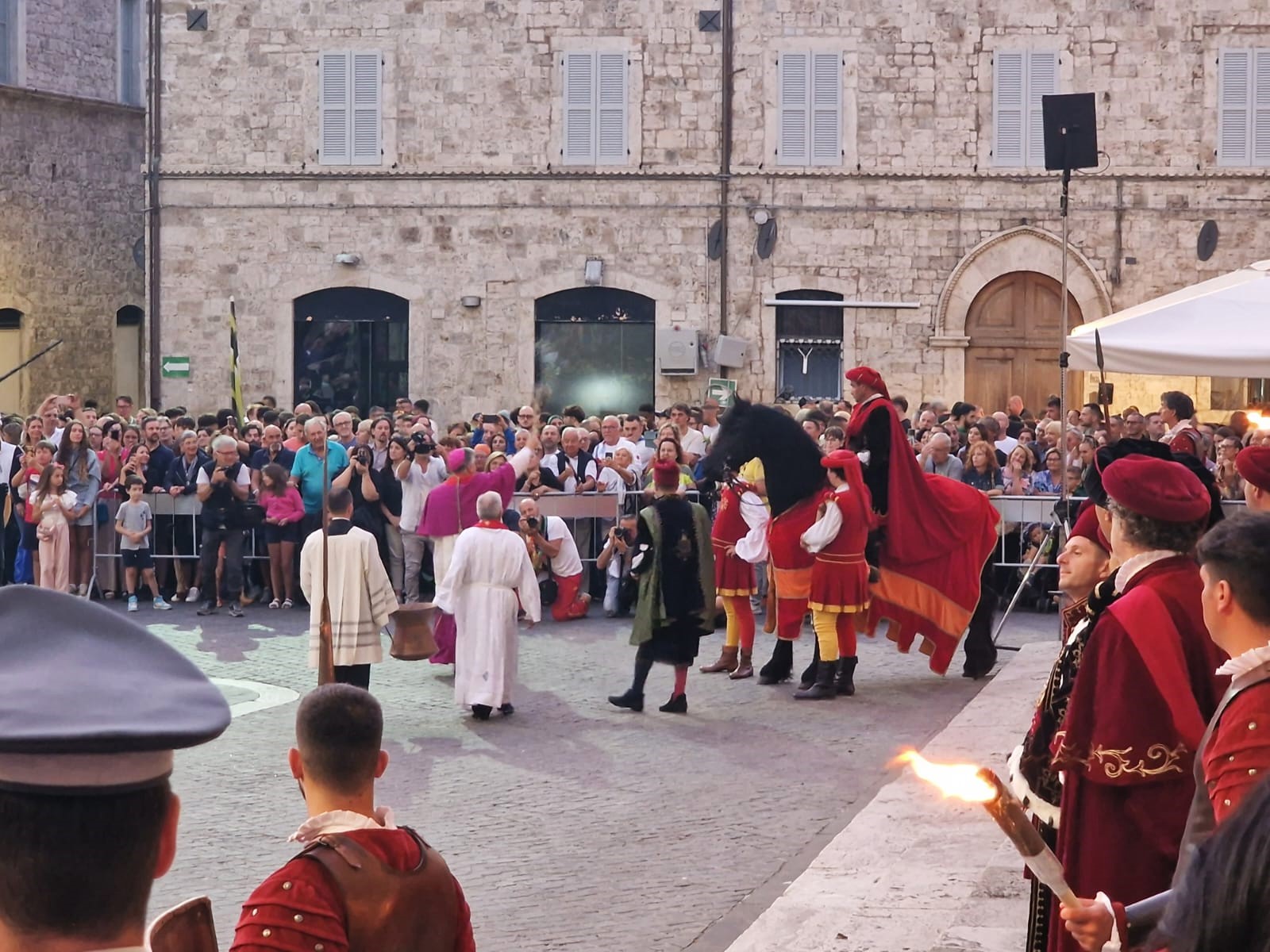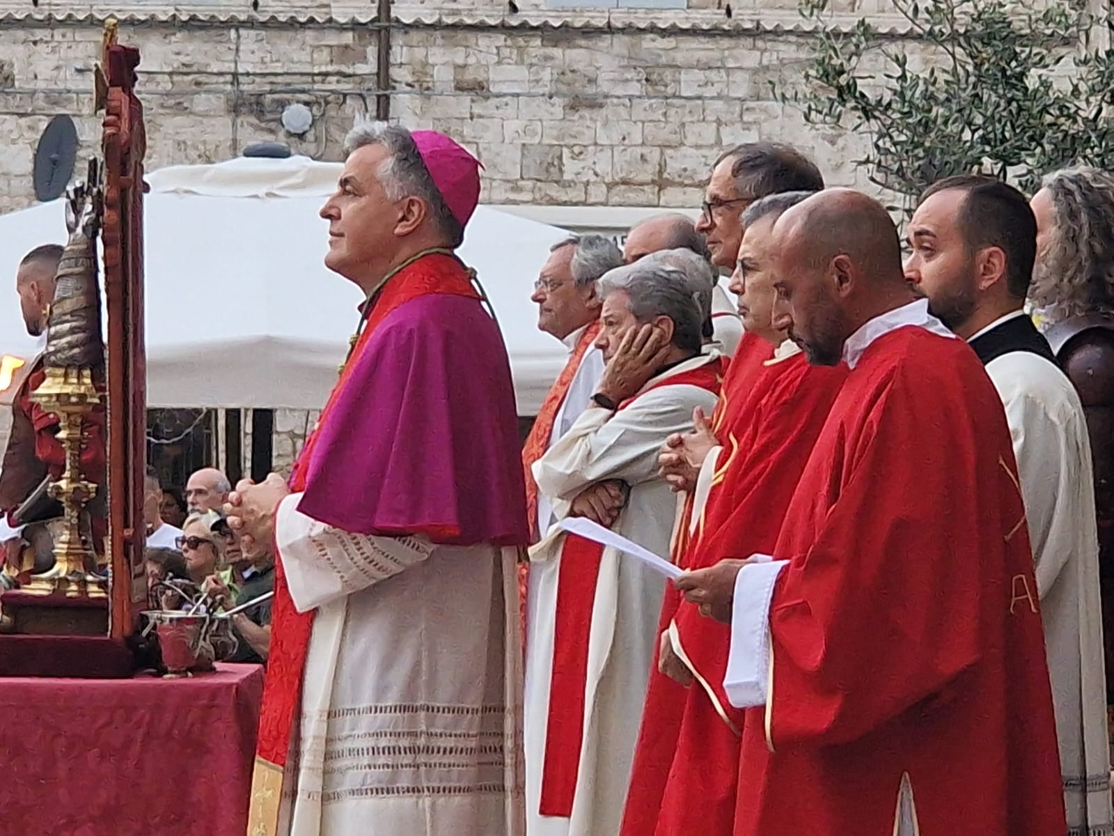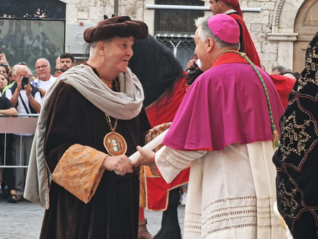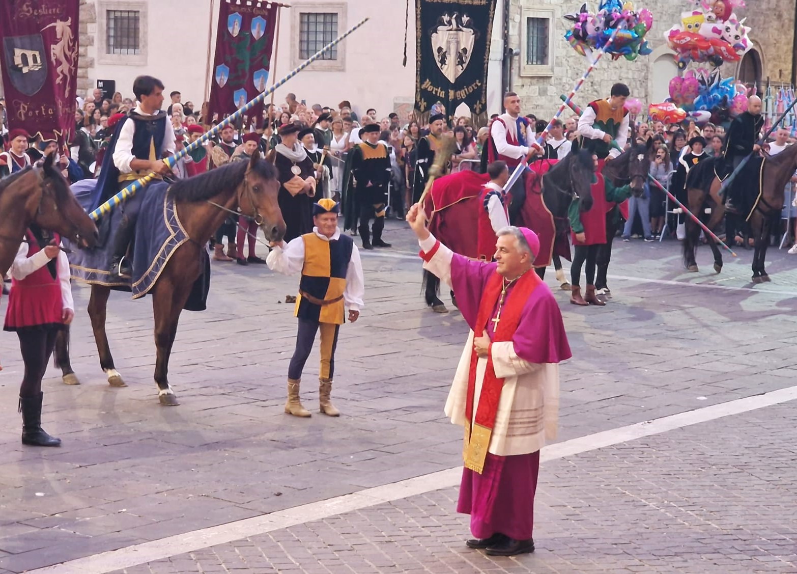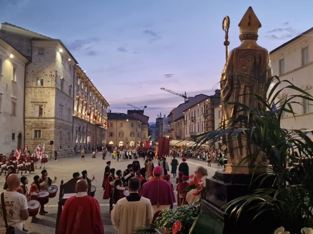 ASCOLI PICENO – Ieri, sabato 3 Agosto 2024, a partire dalle ore 20:00, si è tenuta ad Ascoli Piceno, in piazza Arringo, dinanzi alla Cattedrale di Sant’Emidio, la Celebrazione della Parola presieduta dall’Arcivescovo Gianpiero Palmieri, durante la quale sono stati benedetti i Sestieri della Quintana e offerti i ceri a Sant’Emidio.