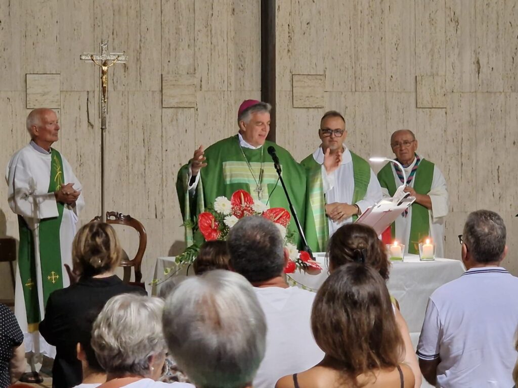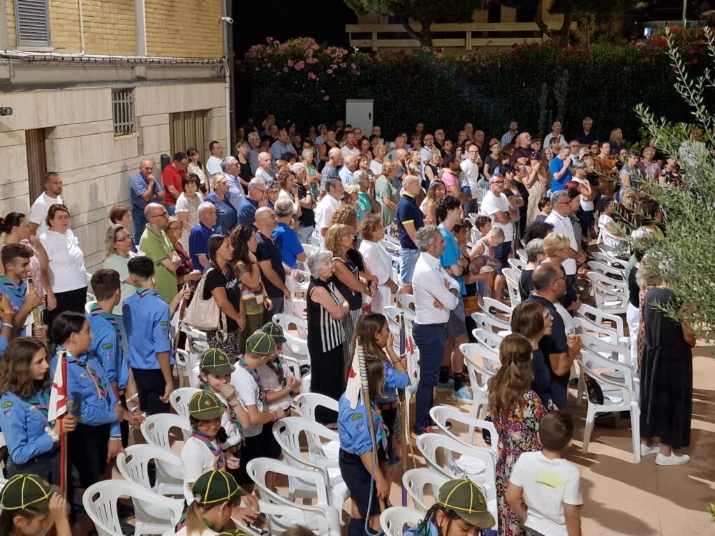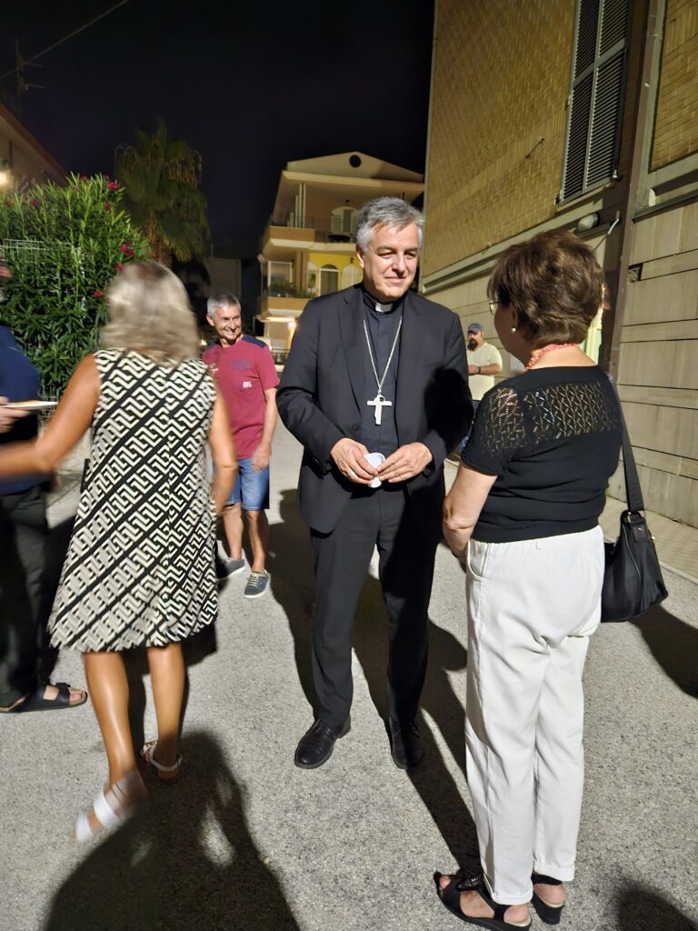 GROTTAMMARE – Una Comunità festante ha accolto domenica 4 agosto il nuovo Vescovo della Diocesi di Ascoli Piceno e della diocesi di San Benedetto del Tronto-Ripatransone-Montalto, Mons. Gianpiero Palmieri. Ad accoglierlo in modo caloroso il Parroco della Gran Madre di Dio, situata a Grottammare sud, Don Roberto Antonio Melone. “Sono felice di conoscere le vostre Comunità, per me stasera stare qui è una gioia” ha esordito il Vescovo Gianpiero. “Noi l’accogliamo tra noi in questa parrocchia – ha spiegato Don Roberto – Con la nostra fede, forza e fragilità, una parrocchia di circa duemila persone ognuna con le sue peculiarità . Siamo felici di averla qui con noi, di stare insieme, la ringraziamo di cuore”.