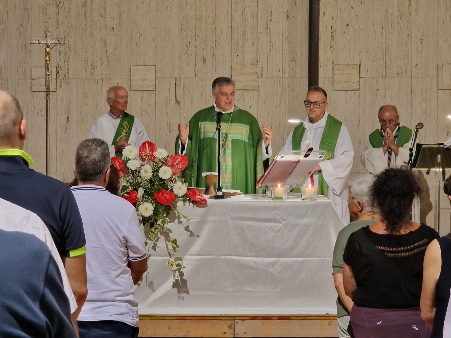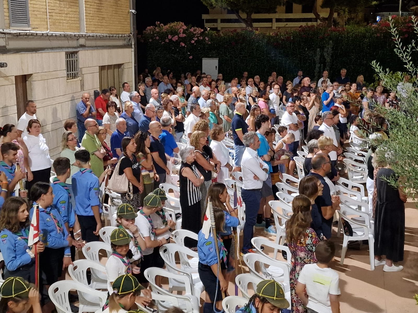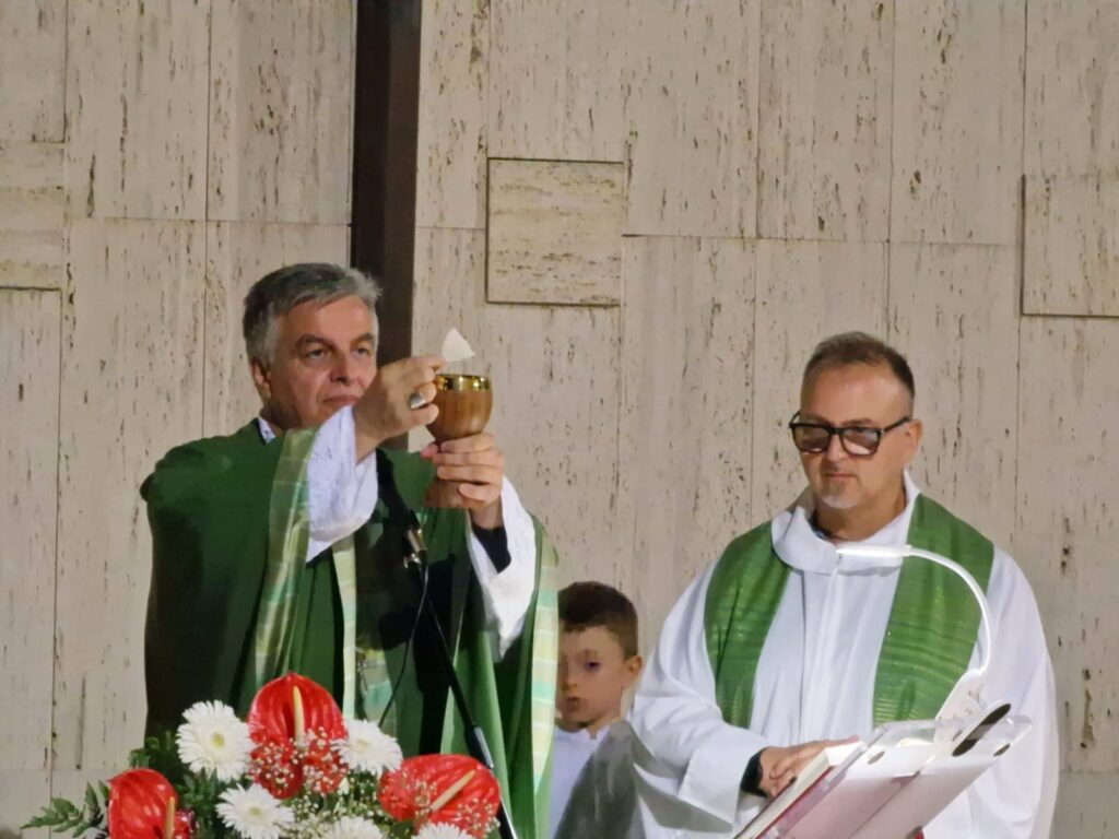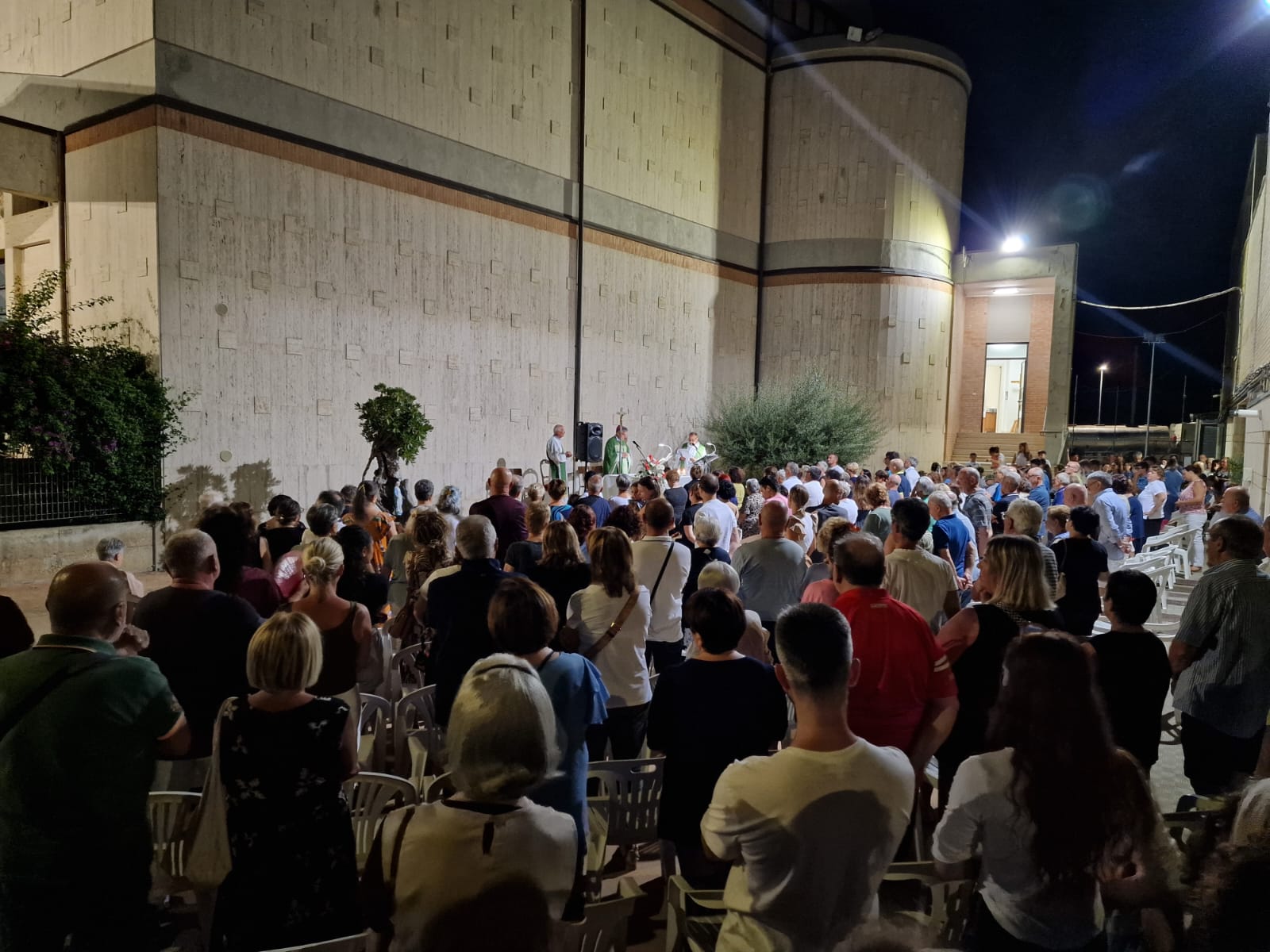 Nello spazio tra la Chiesa e la casa parrocchiale era stato allestito un altare ed una platea, gremita di persone con tantissimi ragazzi e giovani, che hanno animato i canti, soprattutto gli Scout in modo mirabile al fresco della sera. Il Vescovo è stato applaudito e la celebrazione è iniziata con semplicità e tanta fede.