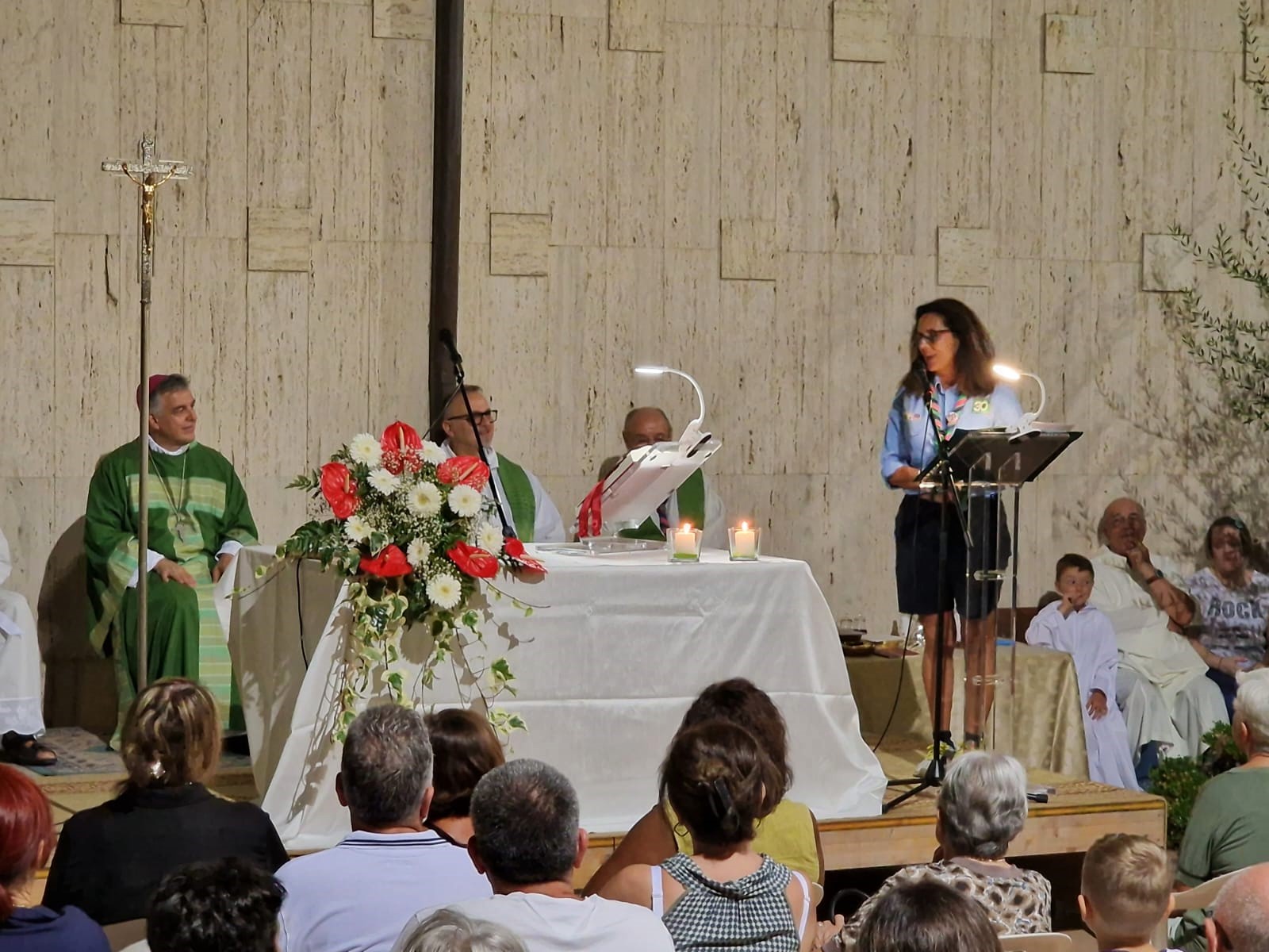 Don Roberto al termine della Celebrazione ha chiamato l’Akela degli Scout, Marina, a nome della parrocchia sono stati fatti tre doni al Vescovo .