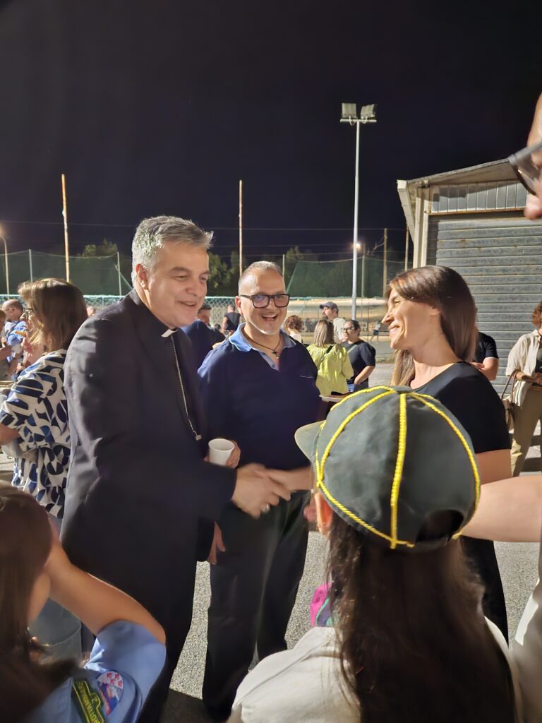 Un albero di ulivo simbolo sacro di sapienza e forza, ma anche di fraternità.. Una ampolla di olio, frutto dell’olivo e ricchissimo di simboli spirituali e infine un cesto con i prodotti tipici della nostra terra. Il Vescovo si è commosso e ha ringraziato per i doni ricchissimi di simbologia citando Sant’Emidio che si festeggia in questi giorni ad Ascoli Piceno – che portò il Vangelo per primo in tutto il nostro territorio e ha spiegato che le feste e i patroni sono ricchissimi di storie di fondazione delle comunità e di simboli significativi , come i graziosi doni ricevuti dalla parrocchia Gran Madre di Dio. Non è mancato, da parte del Vescovo, un complimento per la cultura gastronomica del nostro territorio, che da qualche tempo sta apprezzando. Ci si è recati successivamente presso il retrostante campetto dove don Roberto e le parrocchiane avevano organizzato un momento conviviale e il Vescovo Gianpiero si è intrattenuto a lungo con le persone, con i ragazzi, i fragili, gli anziani con affabilità e semplicità, parlando con tutti, davvero come se ci fossimo da sempre conosciuti. Davvero una bellissima festa e una grande gioia dove davvero aleggiava l’Amore. Grazie Vescovo Gianpiero che trovi il tempo di venire fra noi pur essendo carico di impegni, lo apprezziamo tantissimo e grazie a Don Roberto e alla Parrocchia Gran Madre di Dio per questo fulgido Esempio di Accoglienza e Amore.