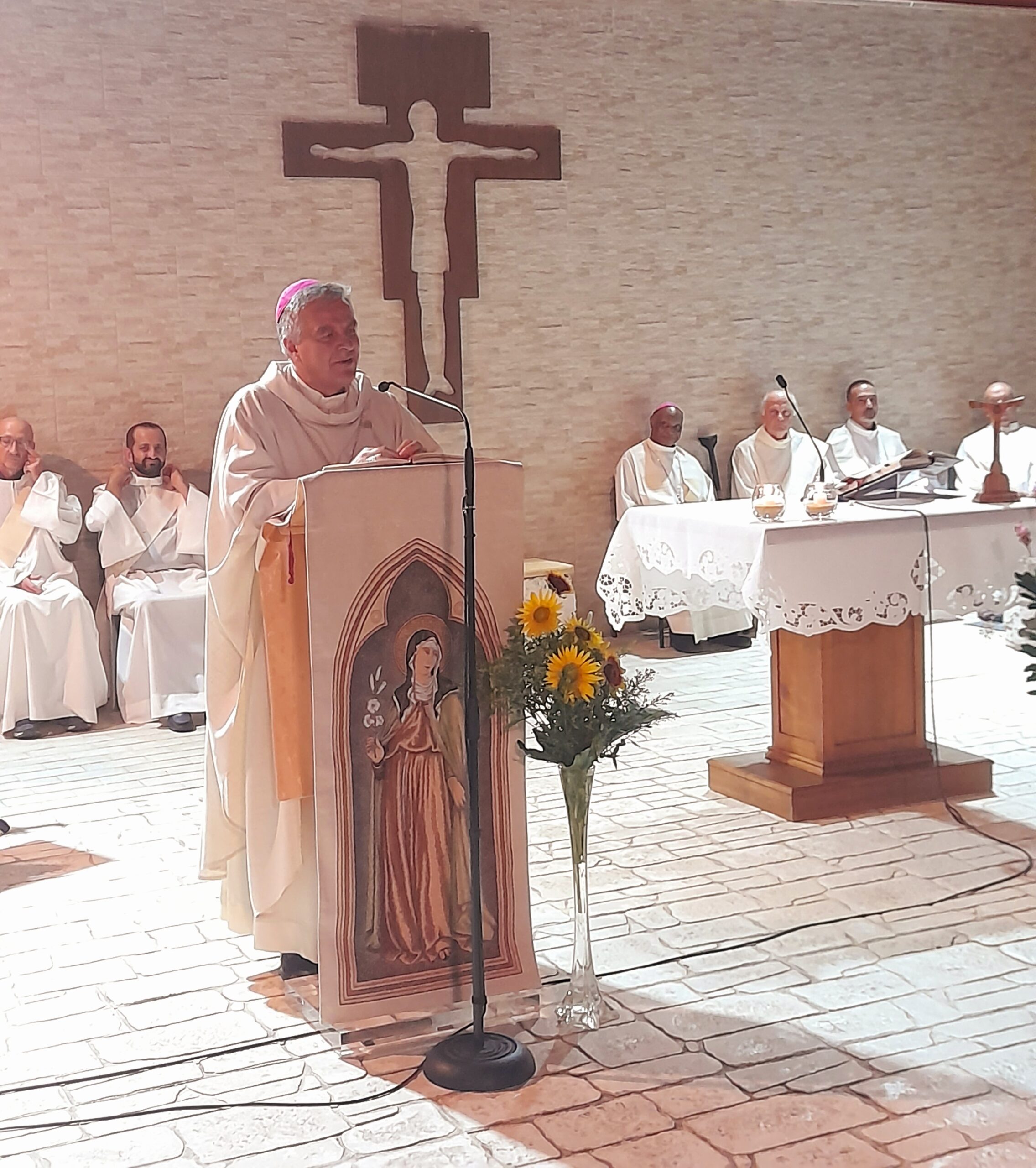 Durante l’omelia, il vescovo Gianpiero ha parlato della kénōsis (n.d.r. chenosi), ovvero dello svuotamento, dell’abbassamento compiuto da Dio nell’atto della sua incarnazione, per avvicinarsi all’uomo e poterlo amare fino in fondo, sottolineando come Dio sia disceso fino a raggiungere l’uomo non solo in senso fisico, ma anche dal punto di vista interiore, nei suoi aspetti più bassi, più fragili, più bui, senza però cadere nel peccato: “La Parola di Dio della festa di Santa Chiara ci permette di entrare sempre di più nel mistero della povertà e della piccolezza. Prima di tutto della povertà e piccolezza di Dio; poi a quella povertà e a quella piccolezza a cui anche noi siamo chiamati e che Chiara e Francesco hanno scoperto. Per far spazio a qualcosa di diverso da noi, dobbiamo per forza ritrarci. Anche Dio, che è tutto, che riempie tutto lo spazio, che è la pienezza di essere, la pienezza di vita, per creare il mondo e soprattutto per creare l’uomo, si deve ritrarre. Dio compie questo atto nuovo di creare il mondo, provando probabilmente, per la prima volta nella storia di Dio, la trepidazione. Egli si sarà chiesto infatti: ‘Che cosa risponderà la mia creatura? Che cosa farà la mia creatura?’. Questo farsi piccolo di Dio è un grande segno del suo amore. Proprio perché ama – e ama sul serio -, Dio prende sul serio le sue creature e il suo amore fa i conti con la libertà dell’uomo. Ma dalla povertà e dalla piccolezza di Dio, è venuta fuori una grande ricchezza per ciascuno di noi: noi infatti non avremmo potuto conoscere in pienezza l’amore di Dio, se non attraverso la povertà e la piccolezza di Gesù. Il Verbo, fatto realmente uomo, che ha sperimentato tutta la gamma dell’umano eccetto il peccato, è il segno del grande amore di Dio che vuole sperimentare la povertà e la piccolezza rispetto al suo essere nella natura di Dio. Dio è nella chenosi del Figlio di Dio, nel suo svuotarsi, nel suo spogliarsi, nel suo diventare povero per amore. È davvero grande l’amore di Dio, se giunge ad abbassarsi a tal punto fino a mettersi davanti all’uomo, al suo stesso livello, ad un livello in cui è possibile l’amore, perché l’amore è possibile soltanto nel gioco reale di due libertà. Dio accetta di stare a questo gioco perché possa effondere l’amore su tutte le creature”.