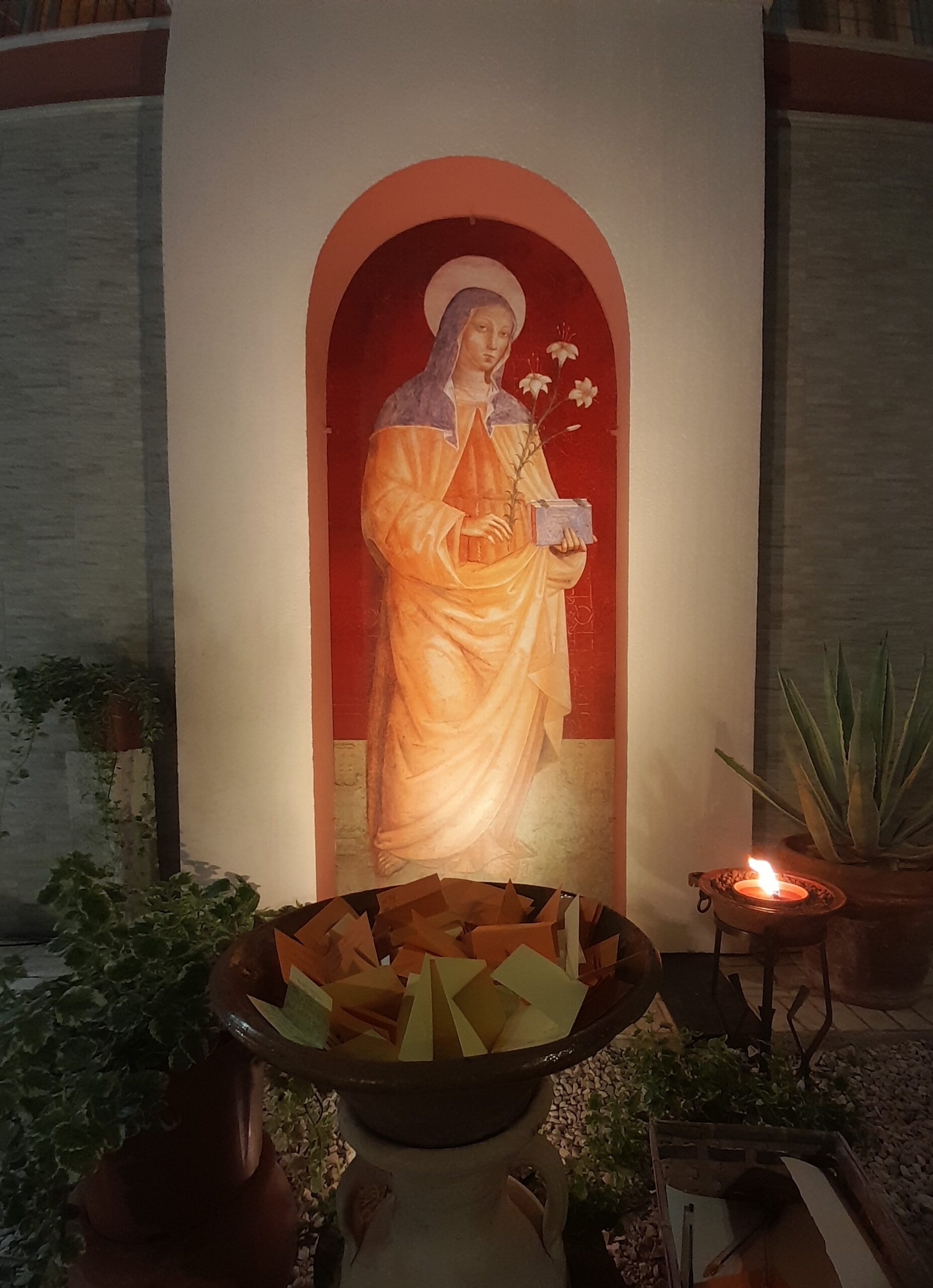 La serata si è conclusa in un clima di cordialità, gioia e profonda spiritualità. Al termine della celebrazione, infatti, le Sorelle Clarisse hanno distribuito un piccolo dono ai presenti, segno della loro preghiera di affidamento a Santa Chiara di tutte le intenzioni che i fedeli di volta in volta raccomandano loro. Molto suggestivo anche il gesto finale richiesto ai convenuti: le Clarisse hanno invitato i presenti a scrivere un bigliettino in cui affidare, nel segreto, una preghiera a Santa Chiara.