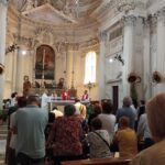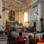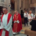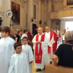 Dall’omelia di Mons. Palmieri: “Siamo qui insieme per onorare San Lorenzo e per assistere al Battesimo di Filippo Maria. Tutti siamo chiamati a diventare discepoli di Gesù nella vita. Anche questo bambino è chiamato a diventare discepolo di Gesù. Il Battesimo ci accompagnerà tutta la vita: l’immersione nel fonte battesimale rappresenta l’entrare nel sepolcro di Gesù e il rinascere come uomini e donne nuove, tanto che i vecchi battisteri erano fatti come una vasca, dentro la quale si scendeva e poi si risaliva”.