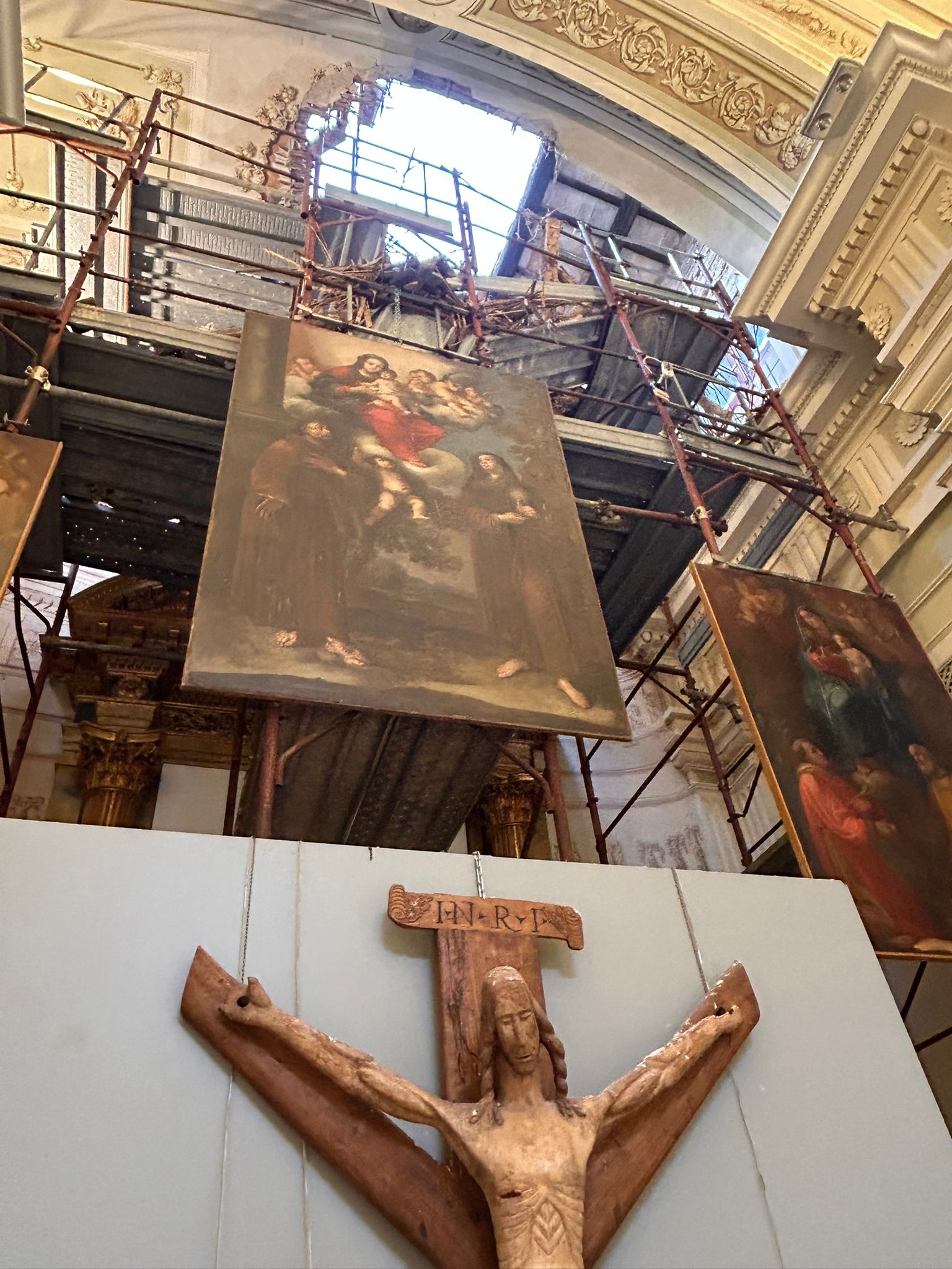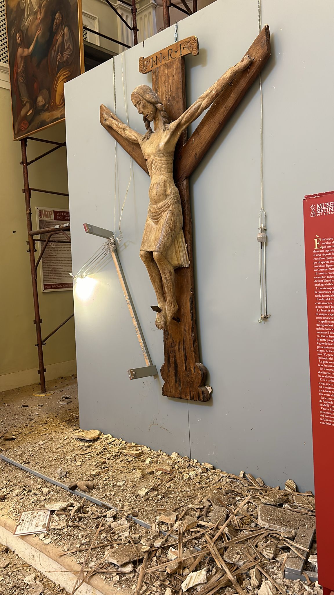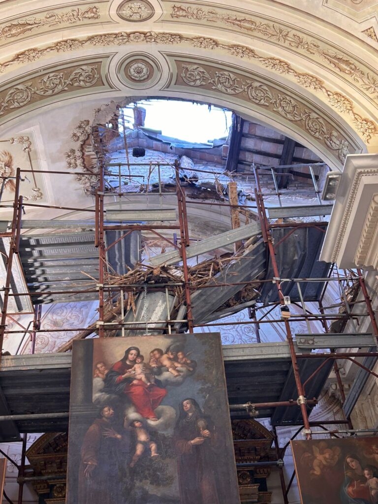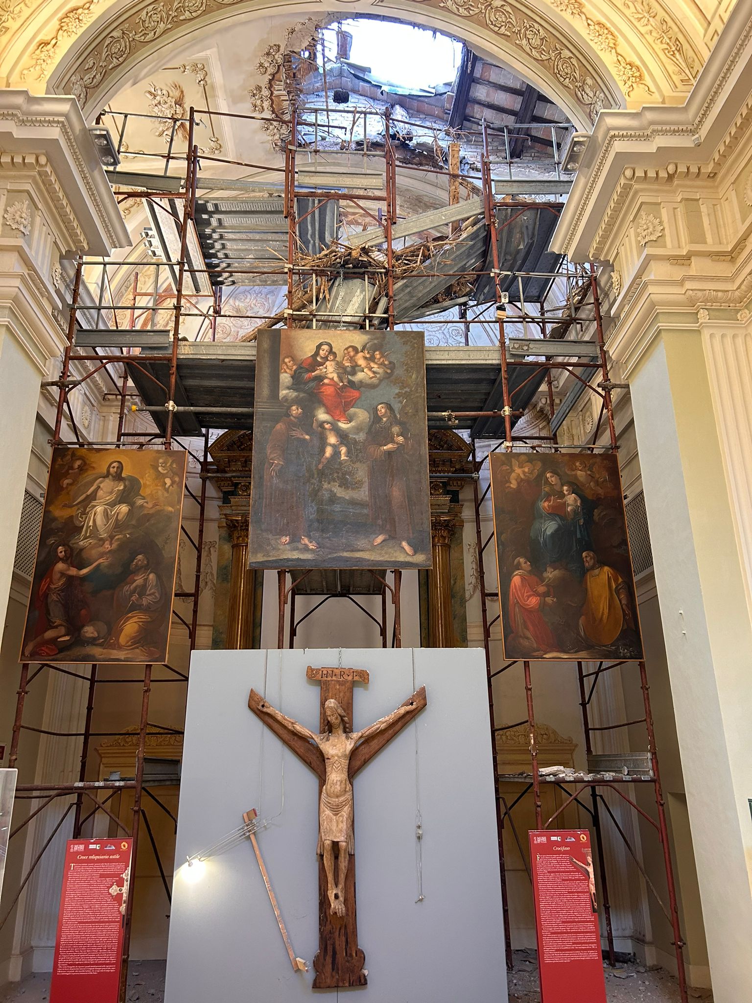 L’impalcatura si era resa necessaria dopo il terremoto del 2016, di cui proprio oggi ricorre il triste anniversario. Il ponteggio era stato installato per ispezionare la volta e la parete di fondo. Grazie alla presenza della struttura le opere sono rimaste illese dal crollo.