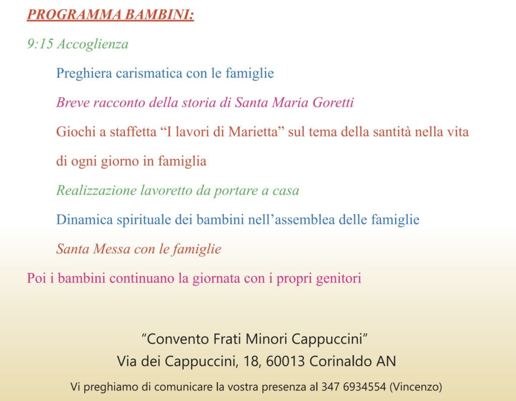 Nel pomeriggio si terrà la visita al Santuario con le reliquie di santa Maria Goretti e, per sua intercessione, ci sarà l’affidamento a Dio delle famiglie. La giornata si concluderà con la visita alla casa dei Goretti, luogo santo dove sono risuonate tante preghiere e si sono compiuti gli atti di fiducia nella Provvidenza e di perdono di questa famiglia.