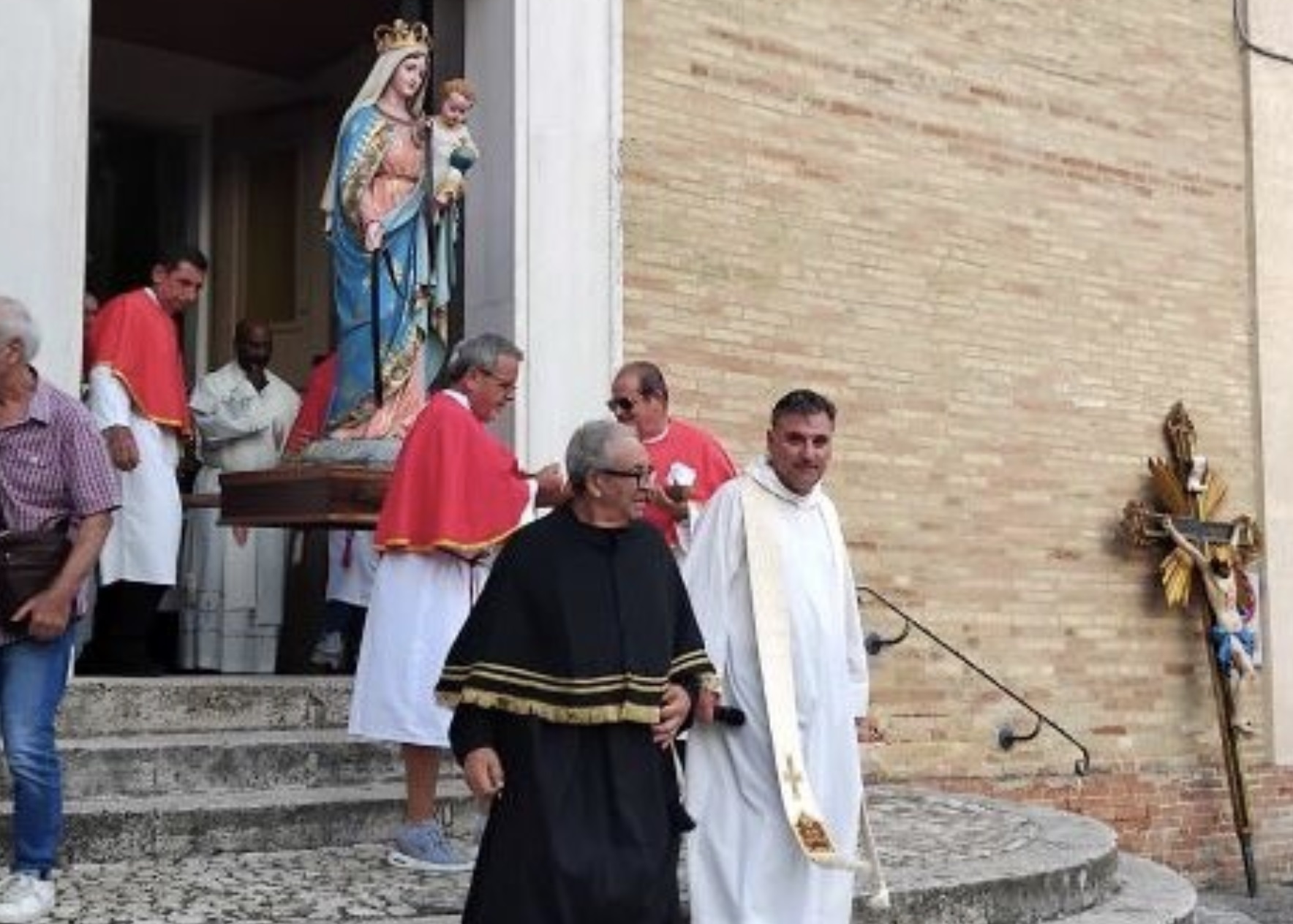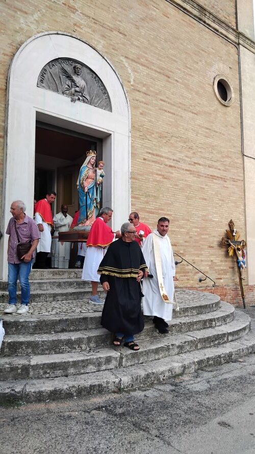 ACQUAVIVA PICENA – Domenica 1° settembre ad Acquaviva Picena è stata onorata la Madonna della Consolazione o della Sacra Cintura. Per questo motivo, quasi tutte le Messe sono state celebrate nella chiesa dedicata a san Lorenzo del convento dei frati agostiniani scalzi. Nell’omelia, padre Emil Kisimba, agostiniano, ha ricordato il legame che esiste tra la tradizione agostiniana e la Madonna della Cintura: «Santa Monica, mamma di sant’Agostino, dopo essere rimasta vedova del marito Patrizio e ancora preoccupata per la vita dissoluta che conduceva suo figlio, chiese conforto e consolazione presso la Vergine Maria. La Madonna ascoltò le sue preghiere. Santa Monica volle imitare la Madre di Cristo anche nel suo abbigliamento ed Ella le apparve con indosso un’ampia veste che partiva dal collo e arrivava fino ai piedi, di stoffa dozzinale e di colore scuro. Alla vita aveva una cintura di pelle rozza che le legava l’abito. La Madonna porse con le sue mani la cintura a santa Monica, la quale poi la diede a suo figlio Agostino, che attraverso l’Ordine da lui stesso fondato diffuse questa cintura in tutto il mondo».