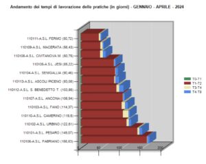 Vorrei aggiungere che l’invalidità civile è un importante settore di cui si occupa l’Istituto ma che a breve sarà investito di importanti novità. È stata approvata dal Parlamento proprio quest’anno, infatti, la nuova riforma dell’invalidità civile con il Decreto Legislativo n. 62/2024 che andrà in vigore nel 2025 in alcune regioni in via sperimentale, mentre dal 2026 in tutta Italia, Marche comprese. Si tratta di una riforma quadro, che rivisita anche la L.n.104, ma l’aspetto più importante legato al discorso che stiamo facendo è che la valutazione sanitaria dell’invalidità civile sarà affidata all’Inps in via esclusiva, quindi la visita non verrà più effettuata dalla AST, bensì verrà eseguita all’interno degli nostri uffici. Questo dovrebbe comportare un’accelerazione complessiva dei tempi, in quanto attualmente i nostri tempi di definizione successivi alla visita sanitaria svolta dall’AST sono di circa 10/15 giorni, come risulta da questi grafici che riportano i dati, aggiornati ad Aprile 2024, sui tempi dell’invalidità civile a livello regionale con evidenziati quelli di Ascoli Piceno e San Benedetto del Tronto: i tempi di convocazione a visita AST (ex ASUR) sono T1 e T2 e sono segnalati in rosso; da T3 a T8, invece, sono i tempi di attività di competenza INPS e sono segnalati in verde.