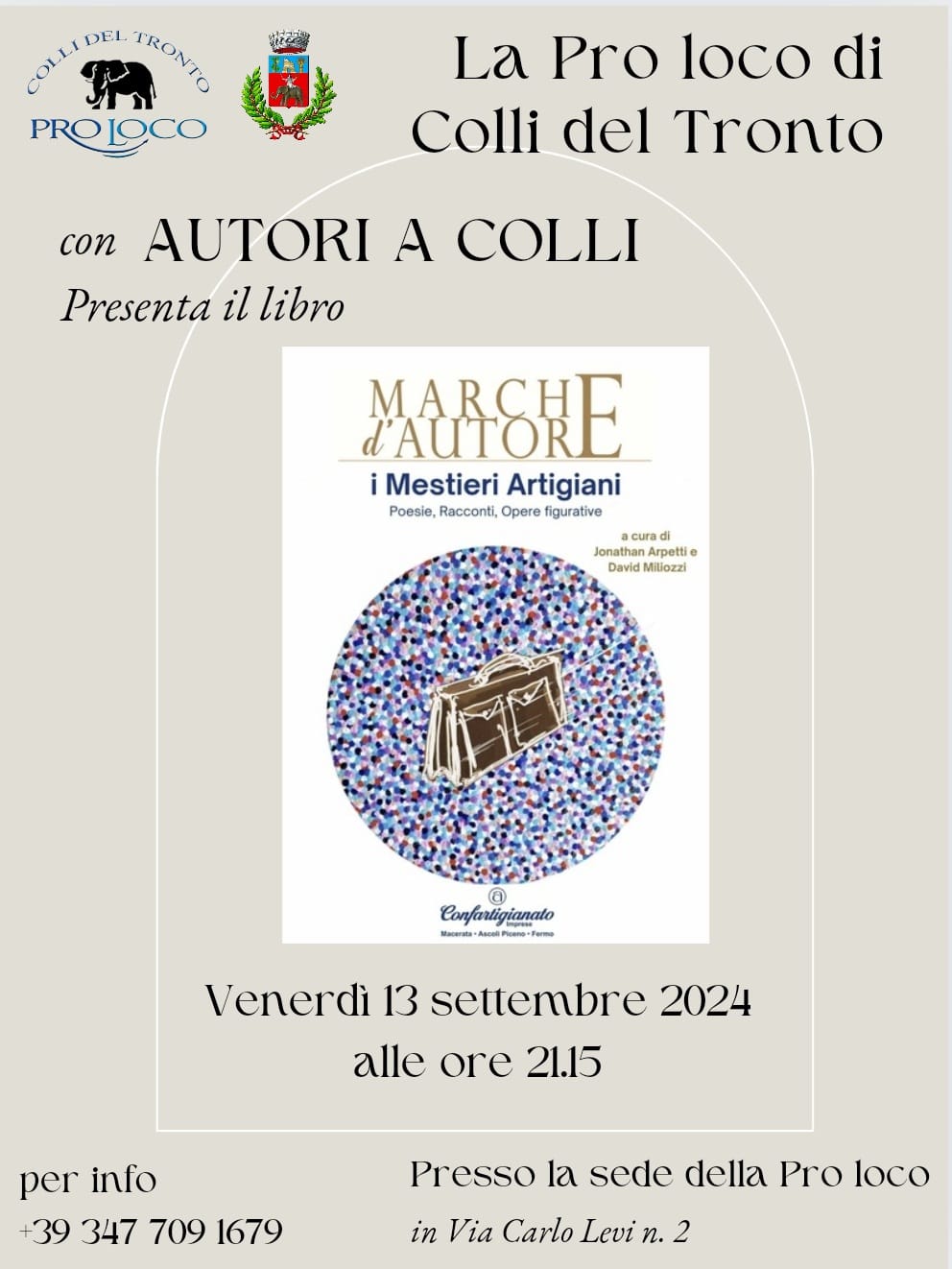 COLLI DEL TRONTO – Venerdì 13 settembre alle ore 21.15 presso la sede della Pro Loco di Colli del Tronto, in Via Carlo Levi 2, si terrà la presentazione della nuova antologia Marche d’Autore, quest’anno dedicata al tema dei Mestieri Artigiani.