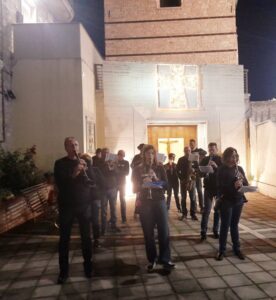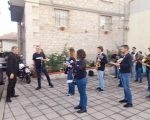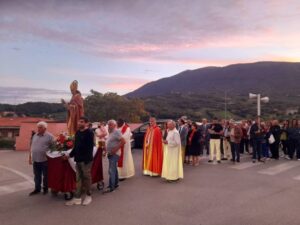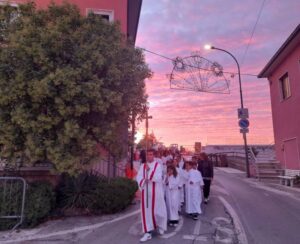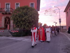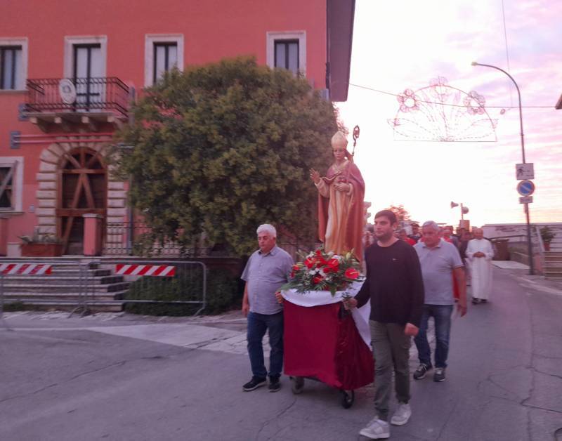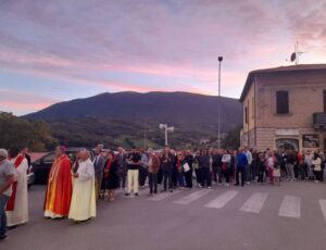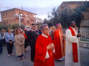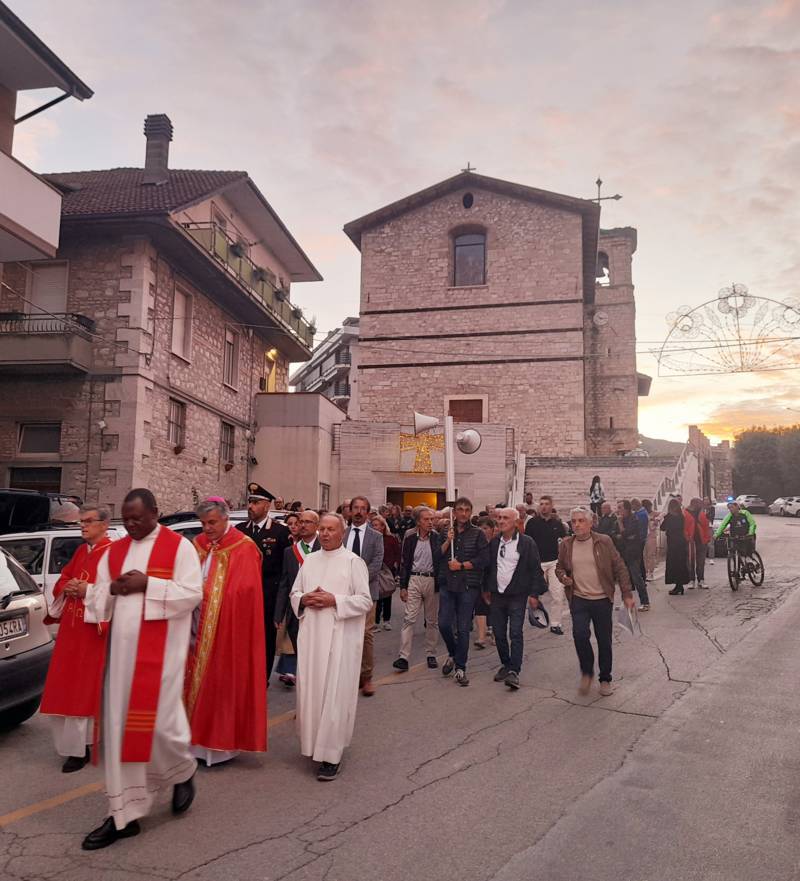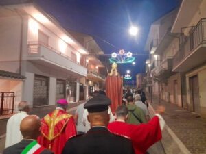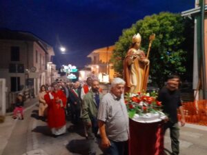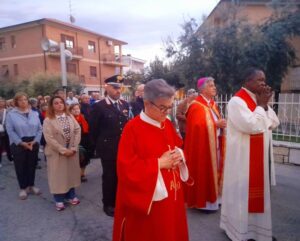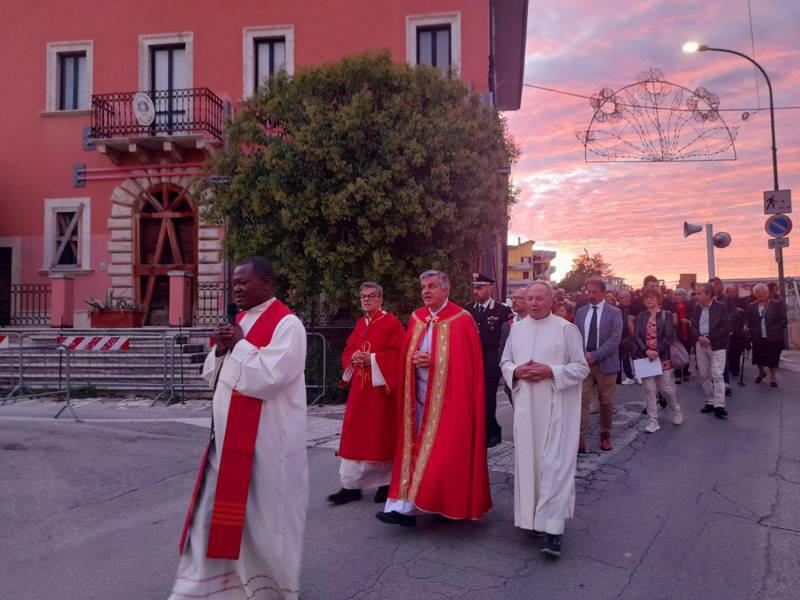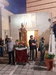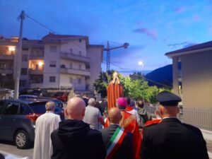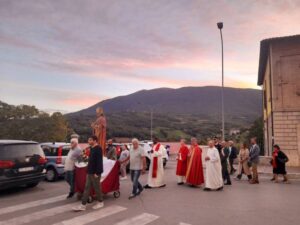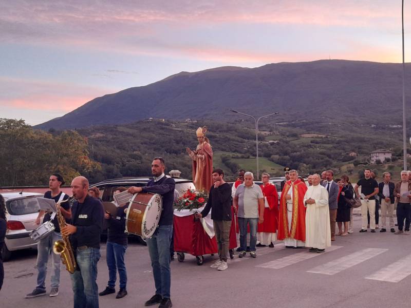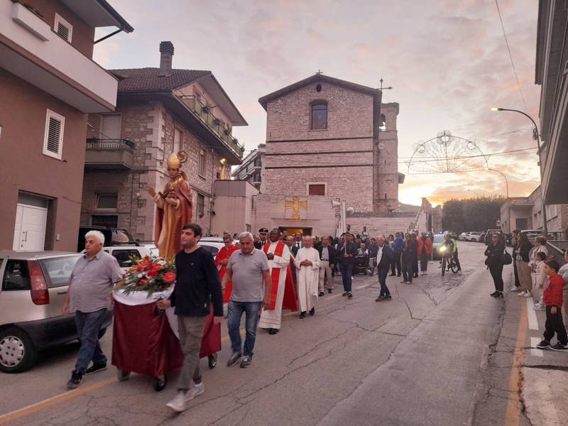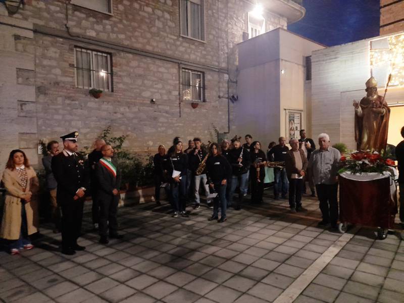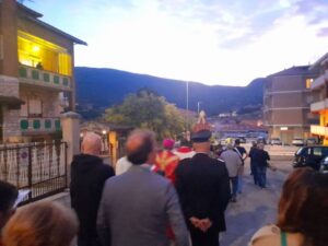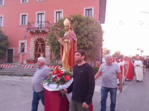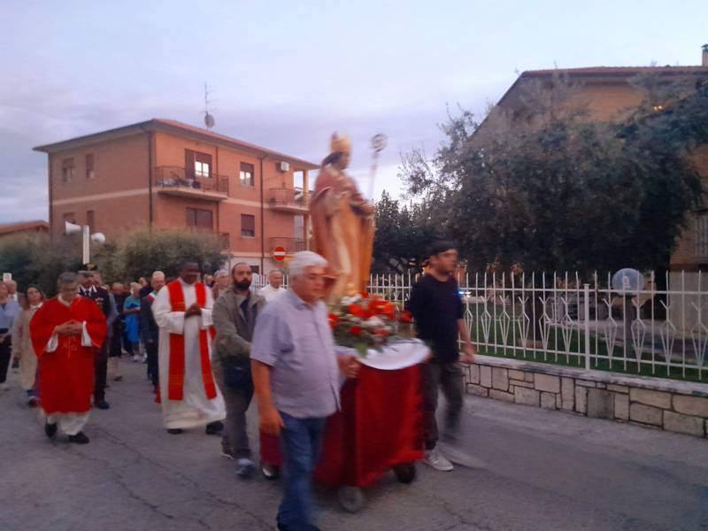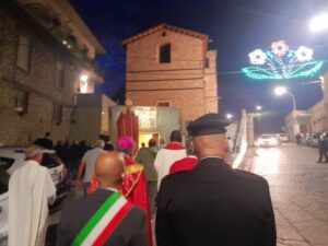Terminata la Messa, i fedeli, hanno dato vita alla consueta processione per le vie del quartiere con la statua di San Gennaro, cantando e pregando. Ad accompagnarli il coro parrocchiale “Schola Cantorum”, diretto da Emidio Bollettini e accompagnato all’organo da Mirko Peci, e l’unico corpo bandistico della città, la Foliband, diretta dal M.° Alberto Albanesi, nella sua formazione al completo. Presente tra i musicisti anche la presidente dell’omonima associazione musicale, la clarinettista Maria Grazia Calcagni. Lungo le strade percorse, diverse persone malate o anziane si sono affacciate ai balconi o si sono avvicinate all’uscio delle porte di casa per vedere passare la statua di San Gennaro e il corteo. Mons. Palmieri ha fatto sentire a tutti loro la sua vicinanza e quella del Signore, a volte da lontano imponendo la mano per benedire, altre volte da vicino per abbracciare, altre volte ancora solo per accennare con lo sguardo, uno sguardo però intenso, colmo di partecipazione, come a dire a ciascuno: “Io ti vedo e anche il Signore ti vede e vede la tua sofferenza“.