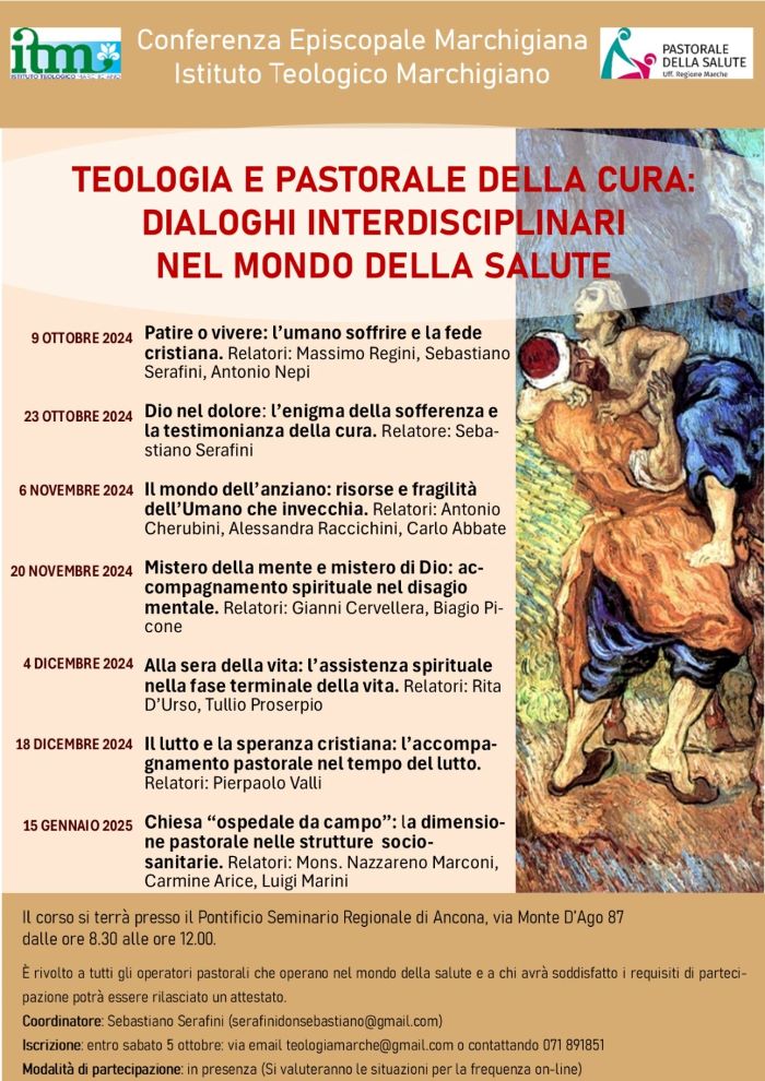 MARCHE – La Conferenza episcopale marchigiana, l’Istituto Teologico Marchigiano in collaborazione con la Pastorale della Salute Ufficio Regione Marche, promuovono il corso di «Teologia e pastorale della cura: dialoghi interdisciplinari nel mondo della salute». Gli appuntamenti si terranno presso il Pontificio Seminario Regionale di Ancona, situato in via Monte D’Ago 87, dalle 8.30 alle 12.