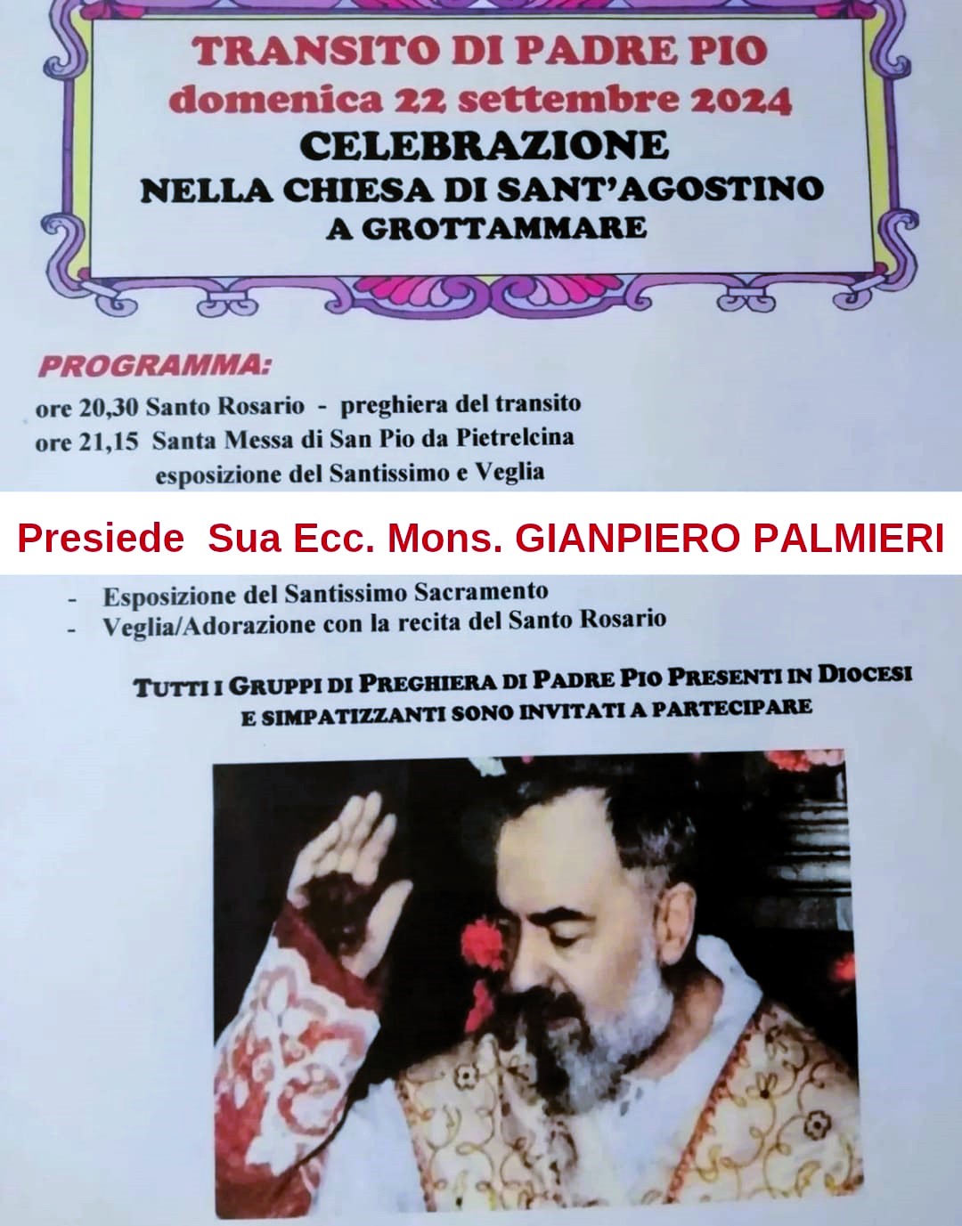 GROTTAMMARE – Domani, domenica 22 settembre, il Gruppo di Preghiera di Padre Pio, coordinato dalla signora Rosanna Carboni, consigliere diocesano dei Gruppi di preghiera di Padre Pio e parrocchiana di san Giovanni Battista, ha organizzato una celebrazione solenne in occasione del “Transito” di san Pio da Pietrelcina presso la chiesa di Sant’Agostino al Paese Alto di Grottammare.