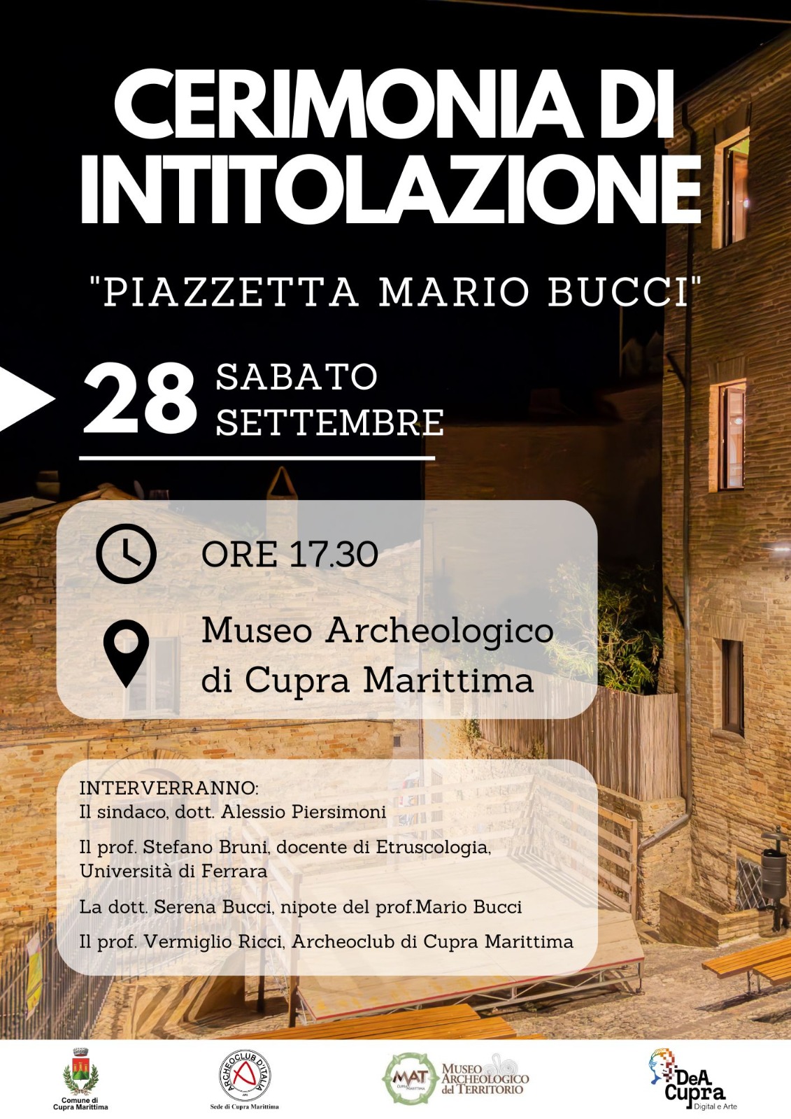 L’Archeoclub d’Italia – sede di Cupra Marittima avanzò all’Amministrazione Comunale la richiesta di intitolare lo spazio esterno a nord del Museo Archeologico, impropriamente definito “cortile”, al Professor Mario Bucci, nato ad Arezzo nel 1925 e deceduto a Cupra Marittima il 21 giugno 2004.