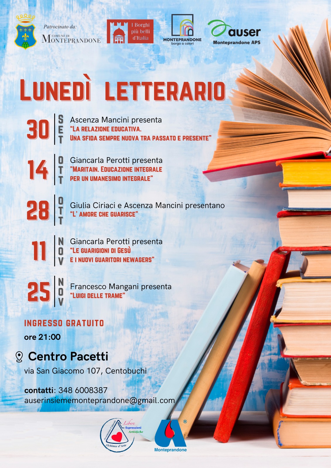 MONTEPRANDONE – Una rassegna letteraria, organizzata da Auser Insieme Monteprandone con il patrocinio del Comune di Monteprandone, viene inaugurata lunedì 30 settembre 2024 presso il Centro Pacetti, alle ore 21, con ingresso gratuito.