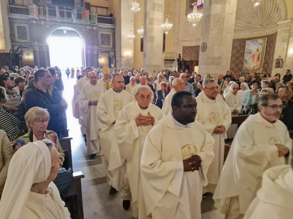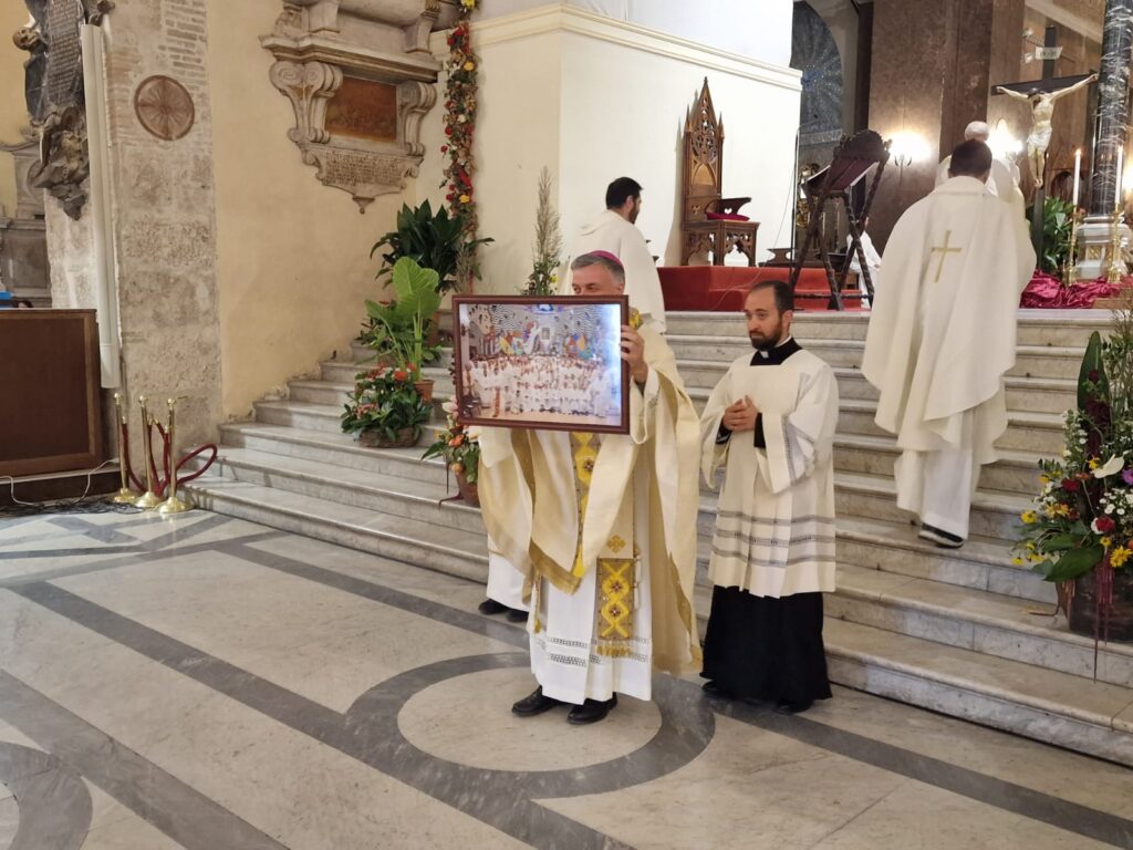 Particolarmente significativo è stato il momento dell’Offertorio, durante il quale il vescovo Gianpiero ha voluto offrire anche una cornice con la fotografia del clero riunito delle due Diocesi di Ascoli Piceno e San Benedetto del Tronto – Ripatransone – Montalto, che, come ha detto egli stesso, custodisce nel suo studio: «Sono tutti i preti e tutti i diaconi delle due Diocesi insieme, un’unità che coinvolge il presbiterio e poi i laici, con cui già da tempo collaboriamo, nelle Caritas, nelle Pastorali Sociali e del Lavoro, nella Pastorale Giovanile. Già da tempo. E più conosco San Benedetto e voi e più ho l’impressione sempre più evidente che ci farà un gran bene camminare insieme, che ci aiuteremo tanto, che condivideremo tante ricchezze. Nessuna pianificazione, nessuna differenza soffocata. Al contrario, ogni identità, ogni ricchezza valorizzata, perché condivisa con gli altri. Nessuno deve essere chiamato a rinunciare a sé, bensì ognuno potrà esprimere tutta la ricchezza che è e che ha, proprio perché la condivide con gli altri. Davvero quello che dobbiamo chiedere a Maria è la Grazia dell’unità.