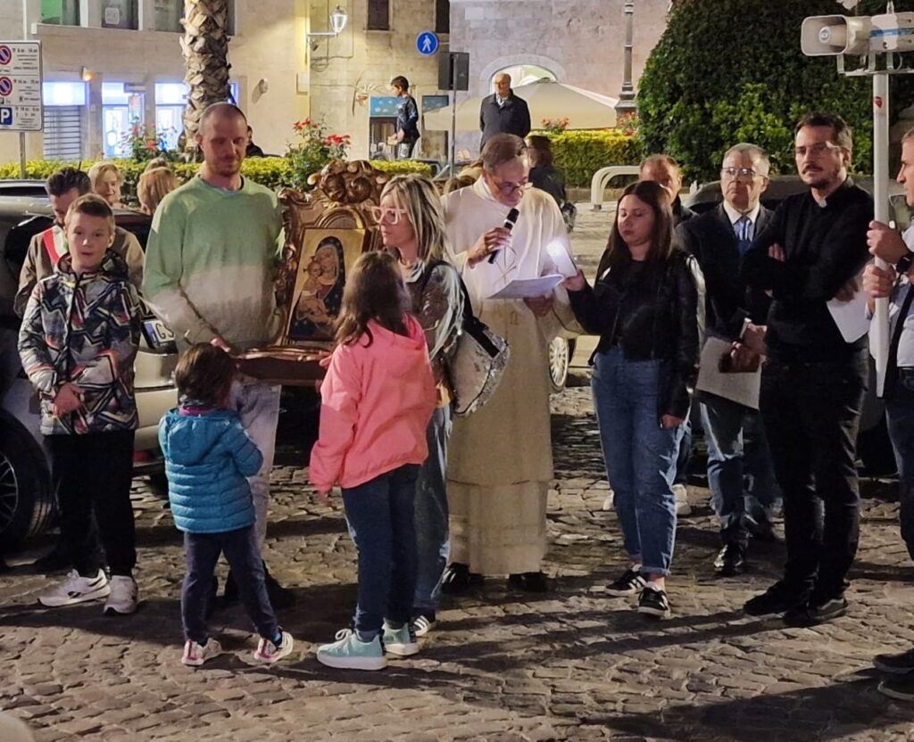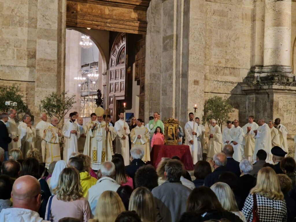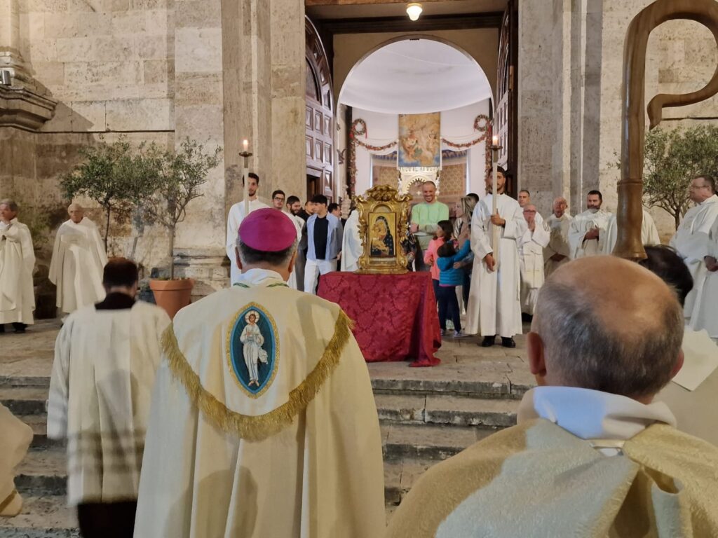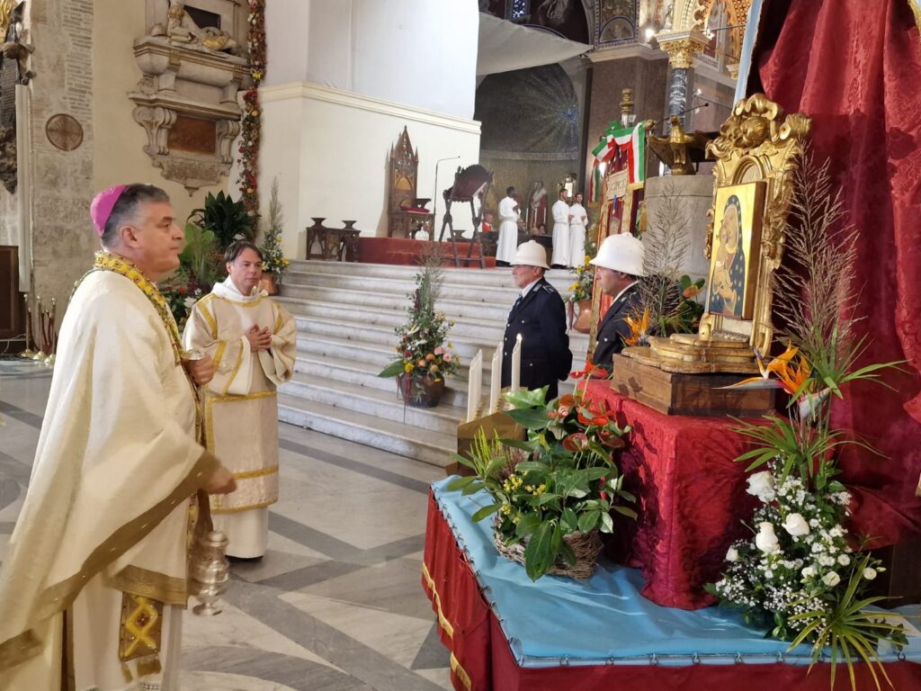 Al termine della Celebrazione Eucaristica, il vescovo, il clero, le autorità civili e militari intervenute e tutti i fedeli si sono recati in piazza Arringo per dare vita alla consueta processione per le vie cittadine con la preziosa icona della Madonna delle Grazie. A trasportare la pregiata opera di Pietro Alemanno, sono stati quest’anno una giovane famiglia e sei giovani della comunità ecclesiale, alcuni appena cresimati ed altri scelti in rappresentanza dei vari gruppi, movimenti ed associazioni ecclesiali.