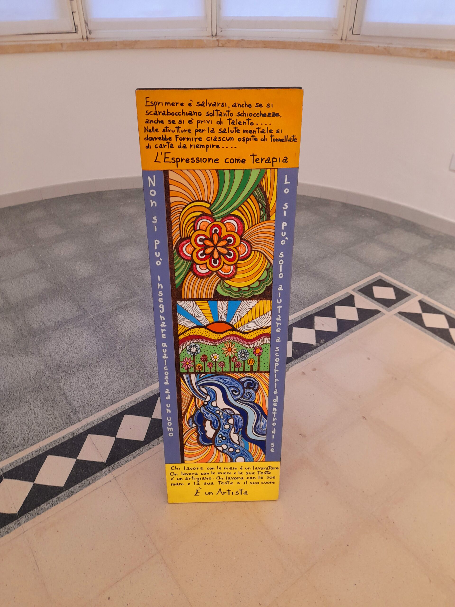 Credo questa mostra sia bellissima, così come lo sono le opere realizzate. Ed è bellissimo che si sia creato un dialogo tra i pazienti e la cittadinanza. Il Centro Diurno è il luogo in cui si realizza la riabilitazione, ovvero in cui si curano quegli elementi di difficoltà che determinate patologie determinano. Questo si può realizzare solo quando c’è una partecipazione attiva del cittadino, quindi quando c’è un incontro con la società. Occasioni come questa permettono il realizzarsi della riabilitazione. Aggiungo anche che queste opere sono state realizzate appositamente per questa mostra, ma si inseriscono all’interno di un laboratorio d’arte che, grazie alla nostra maestra d’arte Stefania Lunerti, portiamo avanti da anni. Realizzare opere d’arte è uno strumento di cura validato ed efficace, che permette la cura dei sintomi negativi, il miglioramento del funzionamento cognitivo, la realizzazione di un dialogo. Come diceva Sua eccellenza, permette una comunicazione, un elemento vitale soprattutto per chi fa difficoltà a trovare una traduzione simbolica, verbale, dei proprio stati d’animo.