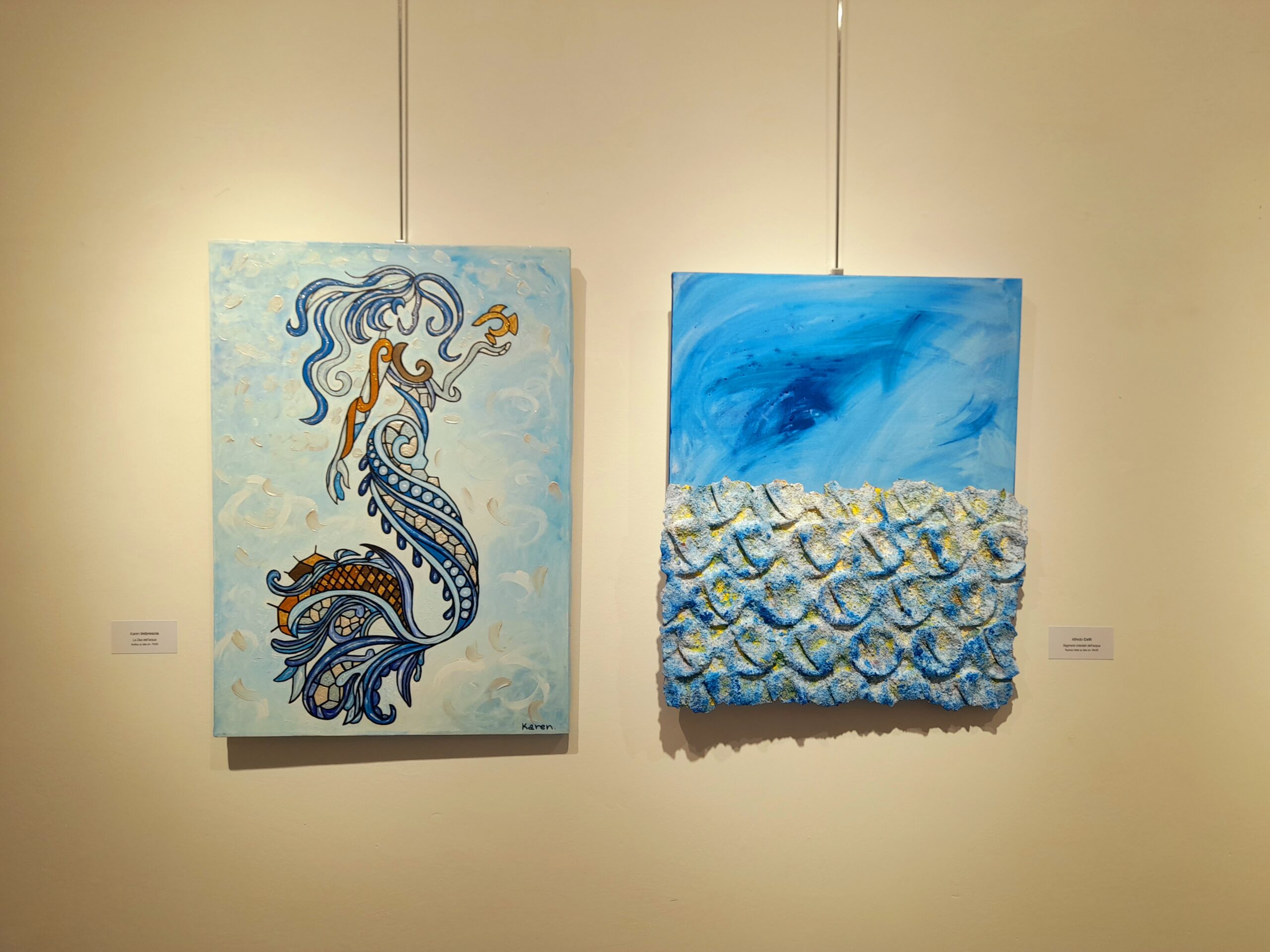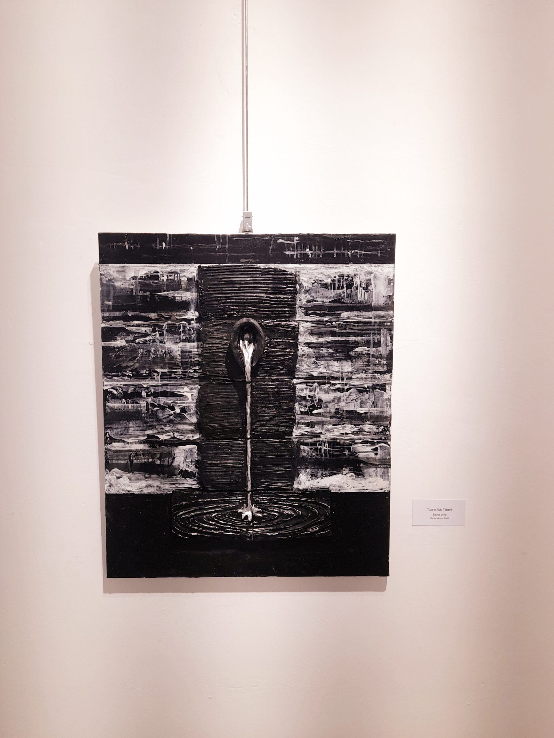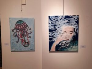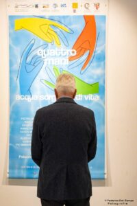 Proprio l’acqua allora è stata scelta come tema della mostra “Quattro mani“, nelle sue diverse variabili: che si tratti delle onde del mare, del getto di una cascata o di una semplice goccia, gli artisti hanno rappresentato ora la potenza e l’impetuosità dell’acqua, ora la sua calma e placidità, attraverso stili eterogenei che vanno dall’astrattismo all’espressionismo, dal figurativo all’informale, dal concettuale allo spazialismo, rendendo la mostra uno spettro eterogeneo e ricchissimo di tecniche, colori, identità, punti di vista ed emozioni.