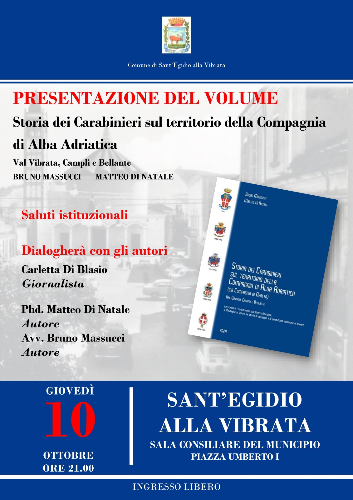 SANT’EGIDIO ALLA VIBRATA – Si terrà Giovedì 10 Ottobre 2024, alle ore 21:00, presso la Sala Consiliare del Municipio di Sant’Egidio alla Vibrata, la presentazione del volume “Storia dei Carabinieri sul territorio della Compagnia di Alba Adriatica (già Compagnia di Nereto)”, scritto dall’avv. Bruno Massucci e dal dottore di ricerca Matteo Di Natale ed edito da Marte Editrice.