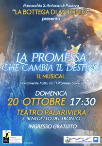 SAN BENEDETTO DEL TRONTO – Andrà in scena Domenica 20 Ottobre, alle ore 17:30, presso il Teatro Palariviera di San Benedetto del Tronto, il musical “La promessa che cambia il destino“, liberamente tratto dal romanzo “I promessi sposi” di Alessandro Manzoni e realizzato dalla compagnia teatrale amatoriale “La Bottega di Antonio“ della Parrocchia Sant’Antonio di Padova della città rivierasca. L’evento, che è gratuito, vanta il patrocinio del Comune di San Benedetto del Tronto e della Commissione per le Pari Opportunità della Regione Marche.