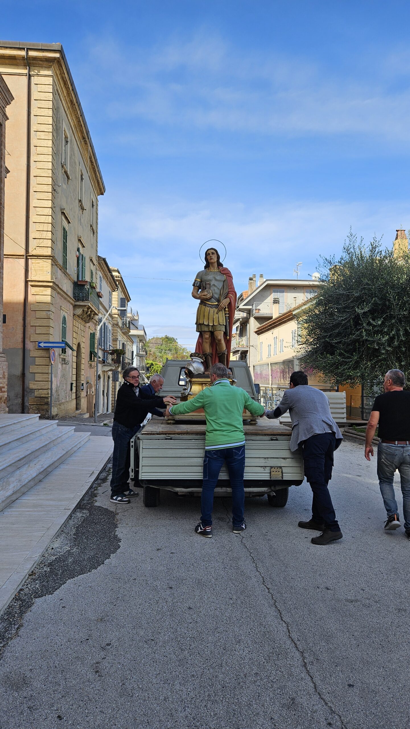 CUPRA MARITTIMA – Un momento carico di emozione: la partenza della statua di San Benedetto Martire da Cupra Marittima, diretta al porto di San Benedetto del Tronto. Intorno alle 14:00 di ieri, domenica 13 ottobre, la statua è stata prelevata dalla chiesa di San Basso e Santa Margherita a Cupra Marittima. “Per tre giorni la statua è rimasta presso la comunità di Cupra Marittima – ci ha spiegato il diacono Luciano Caporossi – e ora, come da tradizione, partirà via mare su una barca”, per giungere con il sindaco di Cupra Alessio Piersimoni e il parroco Don Roberto Traini fino al porto di San Benedetto.