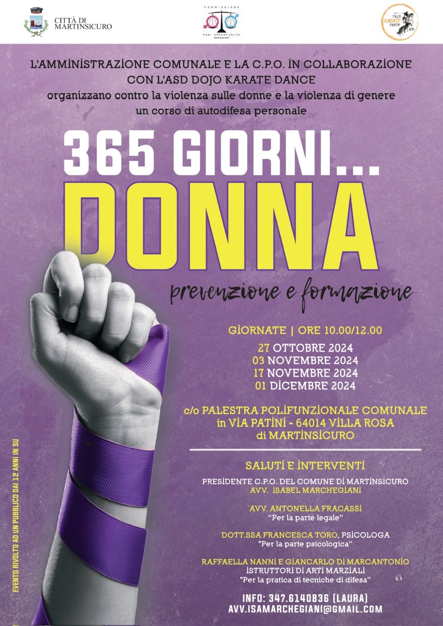 MARTINSICURO – Un’altra importante iniziativa quella che prenderà il via il 27 ottobre, organizzata dalla Commissione Pari Opportunità di Martinsicuro, in collaborazione con l’Asd Dojo Karate Dance. Quattro appuntamenti (27 ottobre, 3 novembre, 17 novembre e 1 dicembre) con un corso di autodifesa personale interamente gratuito rivolto a tutte le donne e ragazze dai 12 anni in su, che si svolgerà presso la Palestra Polifunzionale comunale di via Patini a Villa Rosa di Martinsicuro.