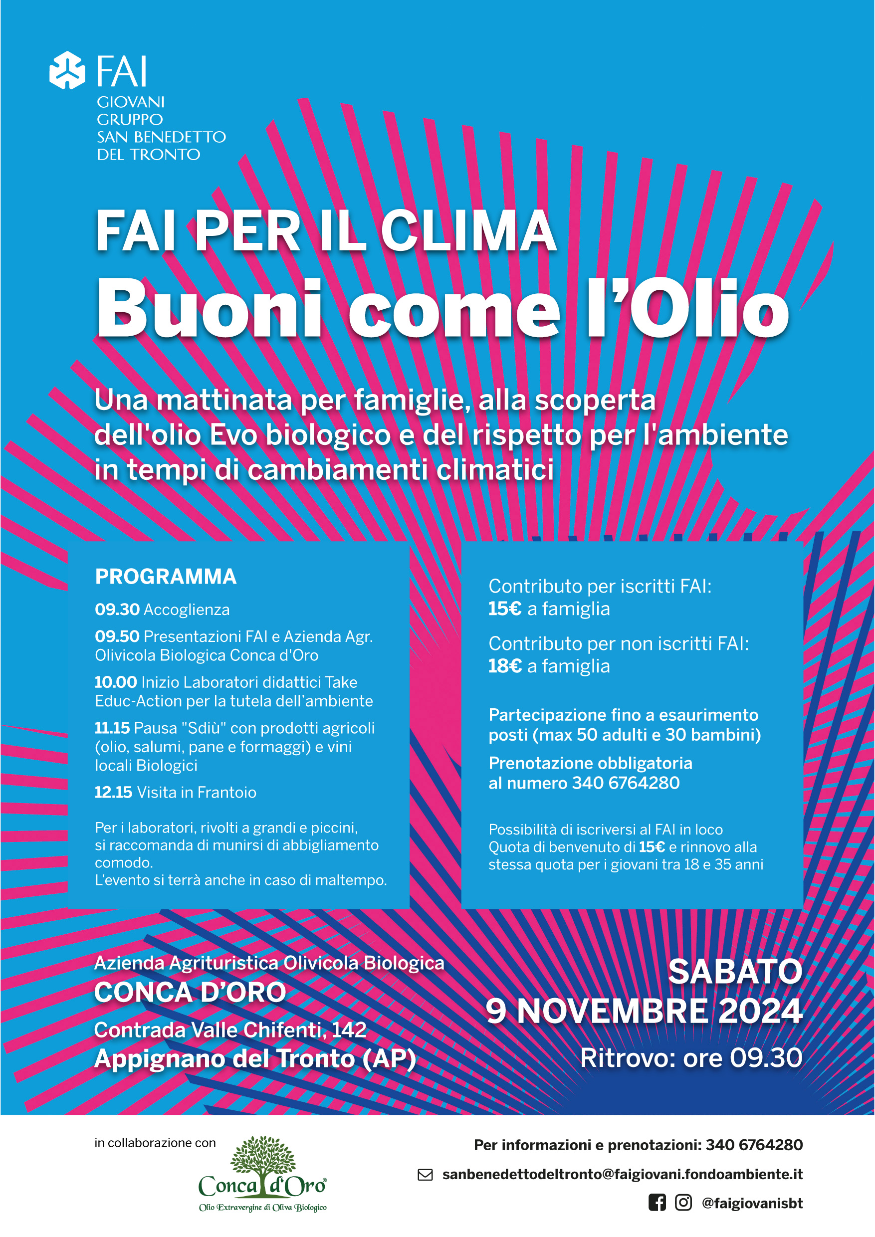 SAN BENEDETTO DEL TRONTO – Il gruppo FAI Giovani San Benedetto del Tronto e l’Azienda Agrituristica Olivicola Biologica Conca d’Oro uniscono le forze per informare e sensibilizzare il pubblico rispetto ai cambiamenti climatici, con l’iniziativa “Buoni come l’Olio”, in programma sabato 9 novembre: una mattinata per famiglie immersi nella natura, tra laboratori didattici, raccolta delle olive per i più piccoli e merenda con prodotti locali. Un viaggio alla scoperta dell’olio extravergine di oliva biologico e del rispetto per l’ambiente in tempi di cambiamenti climatici.