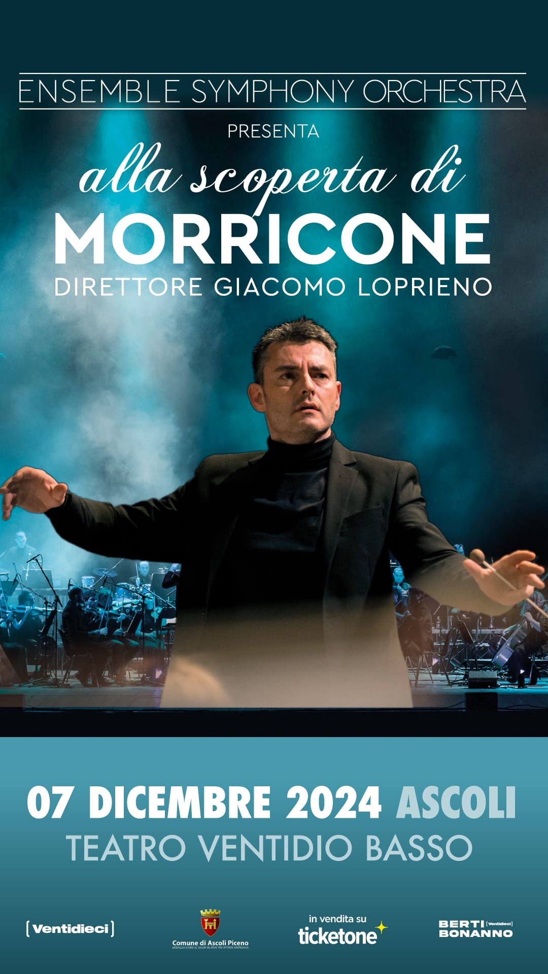 ASCOLI PICENO – Il tributo unico alle musiche del grande compositore italiano si arricchisce di nuove pagine, in gran parte, meno conosciute ma di grande bellezza nello sconfinato repertorio del M° Morricone per dar vita al nuovo spettacolo “Alla scoperta di Morricone”, con l’Ensemble Symphony Orchestra diretta da Giacomo Loprieno, il 7 dicembre al Teatro Ventidio Basso di Ascoli Piceno, data organizzata da Vincenzo Berti e Gianluca Bonanno per Ventidieci con il patrocinio del Comune di Ascoli Piceno.
