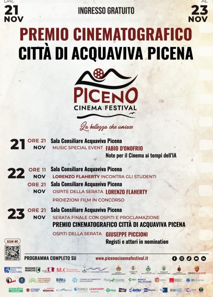 ACQUAVIVA PICENA – Acquaviva Picena ospita la Terza Edizione del Piceno Cinema Festival, dal 21 al 23 novembre 2024, presso la Sala consiliare la quale si trasformerà, per l’occasione, in un palcoscenico per il cinema, la musica e l’incontro con grandi artisti.