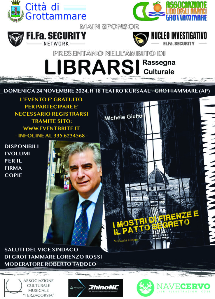 GROTTAMMARE – Dopo un weekend ricco di soddisfazioni per la Lido degli Aranci di Grottammare, che ha vissuto ben due sold-out su due appuntamenti in programma, il primo quello di sabato 29 novembre per “Llegrotte’s Talent”, in cui in un tripudio di risate e applausi fragorosi al Teatro delle Energie si sono esibiti ben 6 talenti grottammaresi doc Alessandra Mora, Roberto Spinozzi, Michelangelo Leporini, Christian Amabili, Luca Baldassarri e Leonardo Tassotti e i 2 ospiti direttamente da Made in Sud Salvatore Gisonna e Simone Schettino, contornati anche dall’eccellente conduzione dello show man Christian Rosati e dal fuoriclasse Angelo Carestia con la sua interpretazione de “La livella” di Totò, si è passati al secondo sold-out, domenica pomeriggio, in una Sala Consiliare del Comune di Grottammare piena all’inverosimile, con il primo appuntamento della Rassegna Letteraria “Librarsi” in edizione autunnale, grazie alla presentazione del libro sulla storia dI Pasqualina, raccontata dalla nipote, la Dott.ssa Donatella Pezzola con l’intervento del Prof. Stefano Petracci e la conduzione del Prof. Luigi Portelli. E allora “the show must go on!” come si suol dire, e la Lido degli Aranci non se lo fa ripetere 2 volte, visto che si prepara e invita tutti al secondo appuntamento della fortunata e sempre più ricercata Rassegna Letteraria, sempre a ingresso gratuito previa prenotazione posto sul sito www.eventbrite.it per questioni di sicurezza, questa domenica, 24 novembre, alle ore 18, questa volta al Teatro Kursaal, con un altro grande personaggio nazionale, il Dott. Michele Giuttari, il Commissario che ha seguito tutto l’iter del Mostro di Firenze, con la presentazione del suo ultimo volume “I Mostri di Firenze e il patto Segreto”, moderatore Roberto Taddeo, intervento a cura del Vice Sindaco Lorenzo Rossi e tante le autorità presenti.