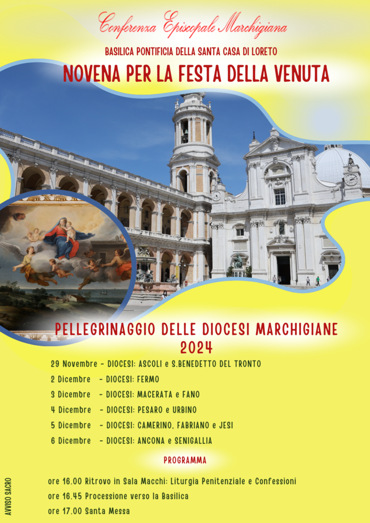 LORETO – La Delegazione Pontificia è lieta di informare che nell’approssimarsi della Novena per la Festa della Venuta, le celebrazioni si svolgeranno con la partecipazione quotidiana delle Diocesi delle Marche. Tale appuntamento è occasione di preparazione alla Festa dell’Immacolata e alla successiva Festa della Venuta che culminerà con la Solennità della Beata Vergine Maria di Loreto il 10 dicembre.