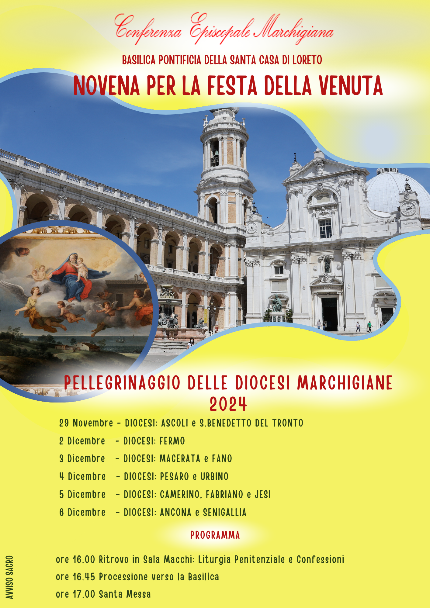 La Novena per la Festa della Venuta inizierà venerdì 29 novembre e si concluderà venerdì 6 dicembre; ogni giorno alle ore 16.00, in Sala Macchi, i pellegrini si raduneranno per la liturgia penitenziale e le confessioni; alle 16.45 entreranno in processione in Santuario per la celebrazione della Santa Messa, presieduta dai Vescovi diocesani; si terminerà con il passaggio nella Santa Casa al canto delle Litanie Lauretane.