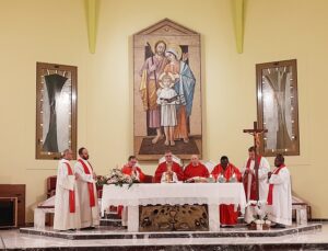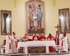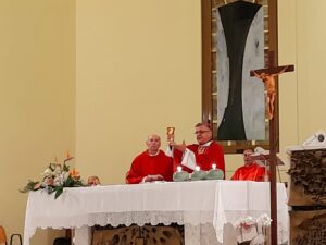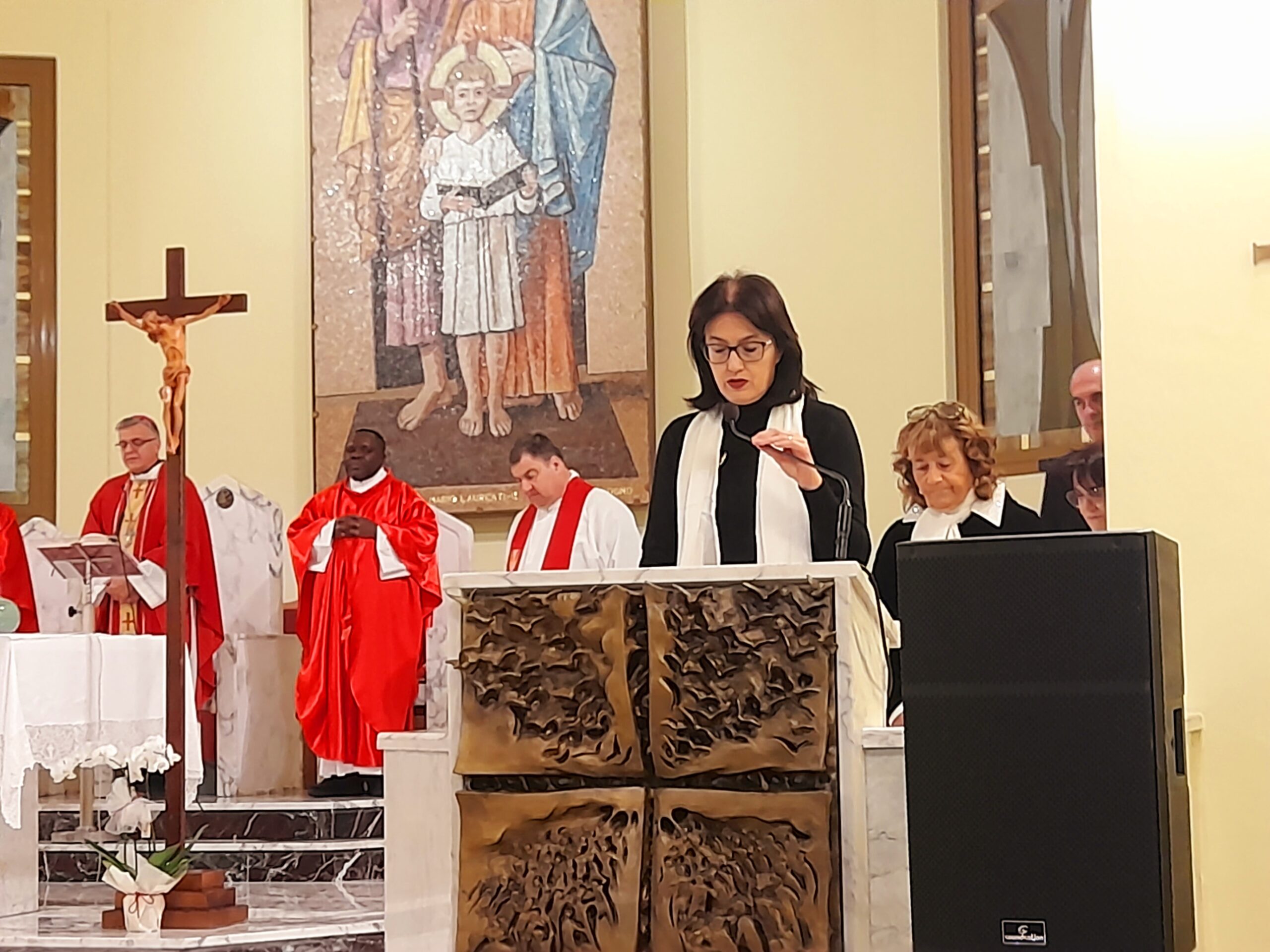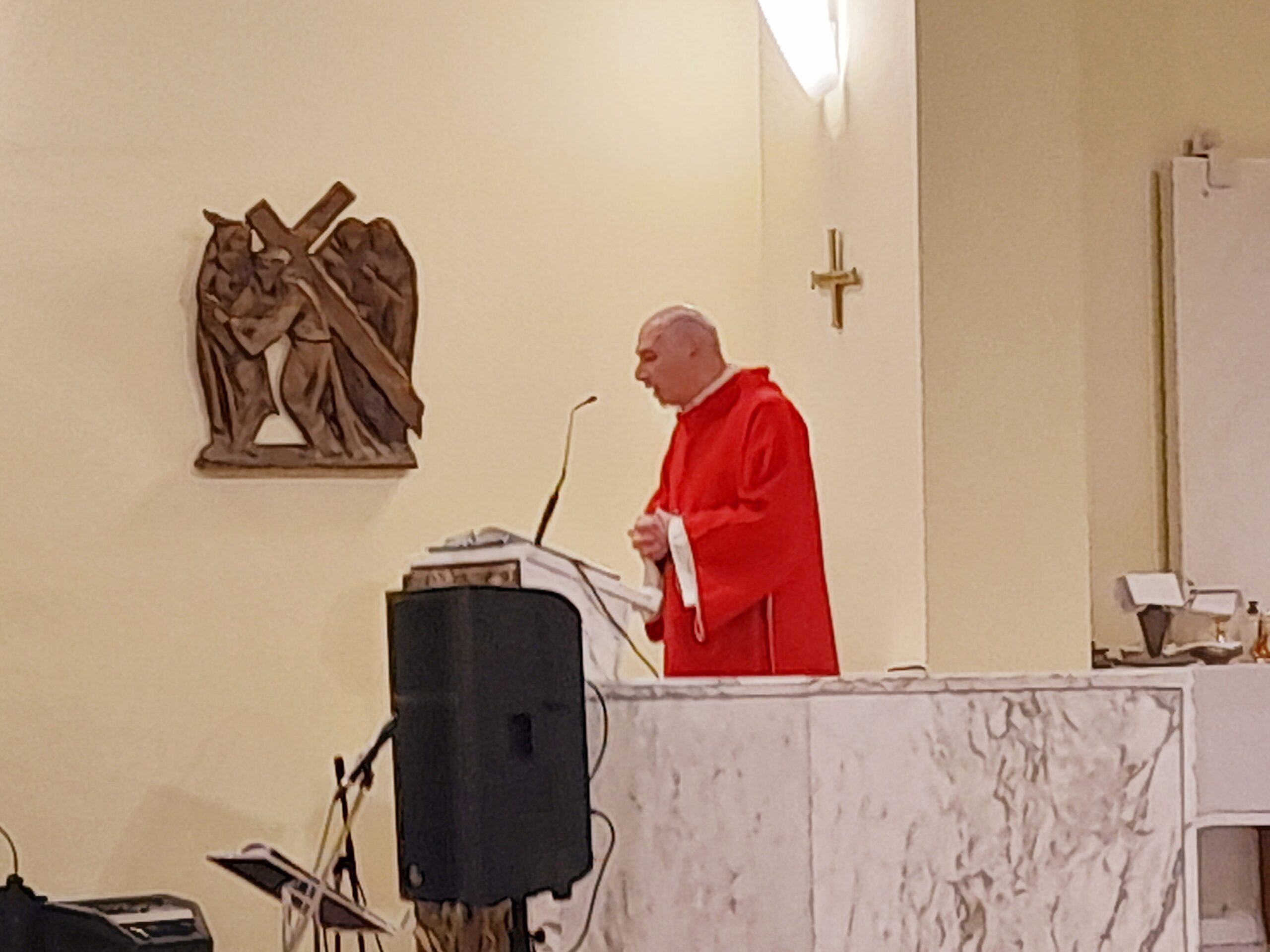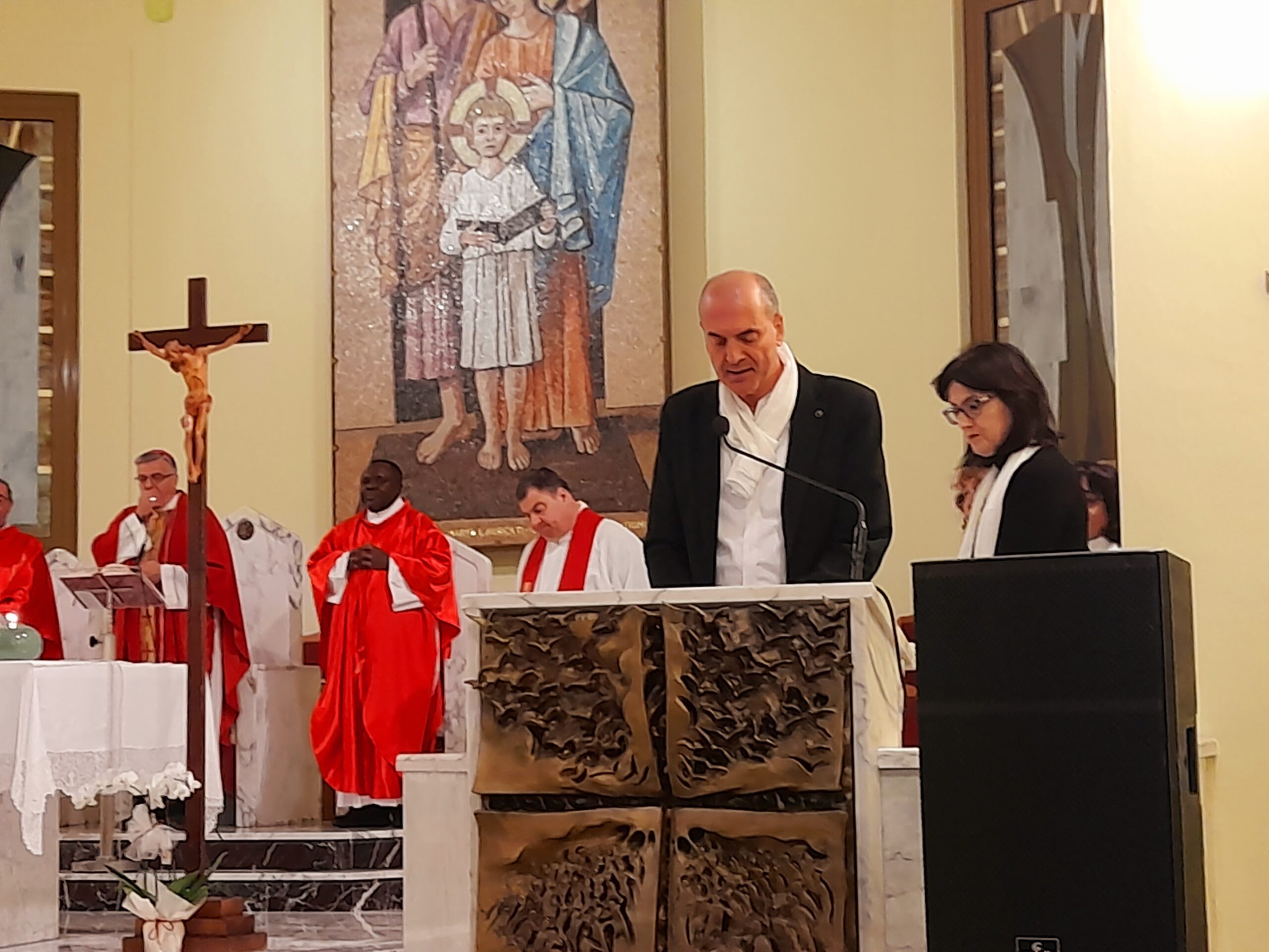 La prima parte della serata è stata caratterizzata dalla Santa Messa, presieduta dal vescovo Palmieri e concelebrata, oltre che dal numeroso popolo di Dio convenuto per l’occasione, anche da alcuni sacerdoti e diaconi della Vicaria: don Francesco Ciabattoni, don Albert Kalafula e Pierluigi Grilli, rispettivamente parroco, assistente parrocchiale e diacono della comunità Sacra Famiglia, che ha ospitato l’evento; don Matteo Calvaresi, parroco dell’unità pastorale Sacro Cuore e Regina Pacis di Centobuchi; don Alfonso Rosati, parroco della comunità San Gabriele dell’Addolorata e Santa Maria Bambina di Villa Rosa; don Alfredo Rosati, parroco della comunità Santissima Annunziata di Porto d’Ascoli; don Juvénal Mukamba Lukumbusho, già assistente parrocchiale della comunità Sacra Famiglia, oggi rettore dell’Università Uvira nel Congo, che è tornato in visita nella parrocchia per un mese.