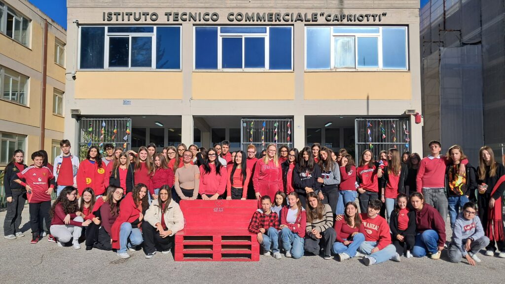 I candidati al ruolo di rappresentanti d’Istituto, inoltre, hanno invitato tutte le studentesse e gli studenti dell’Istituto Tecnico del settore Economico e del Liceo Linguistico a indossare un indumento di colore rosso, simbolo della prevenzione e del contrasto a ogni forma di pregiudizio, discriminazione e violenza. All’ingresso dell’Istituto i ragazzi hanno allestito una panchina rossa, sulla quale campeggiano il 1522, il numero gratuito di pubblica utilità antiviolenza e stalking istituito nel 2006 dal Dipartimento per le Pari Opportunità, il #signalforhelp, il gesto diffusosi globalmente dopo la crescita esponenziale di casi di violenza domestica, e un manifesto, ideato dalla studentessa Anna Marcozzi, che raffigura la sagoma di una donna avvolta da un filo rosso: tale nastro rappresenta la reclusione e la violenza che imprigionano la donna, ma, allo stesso tempo, la libertà e il coraggio, necessari per liberarsi.